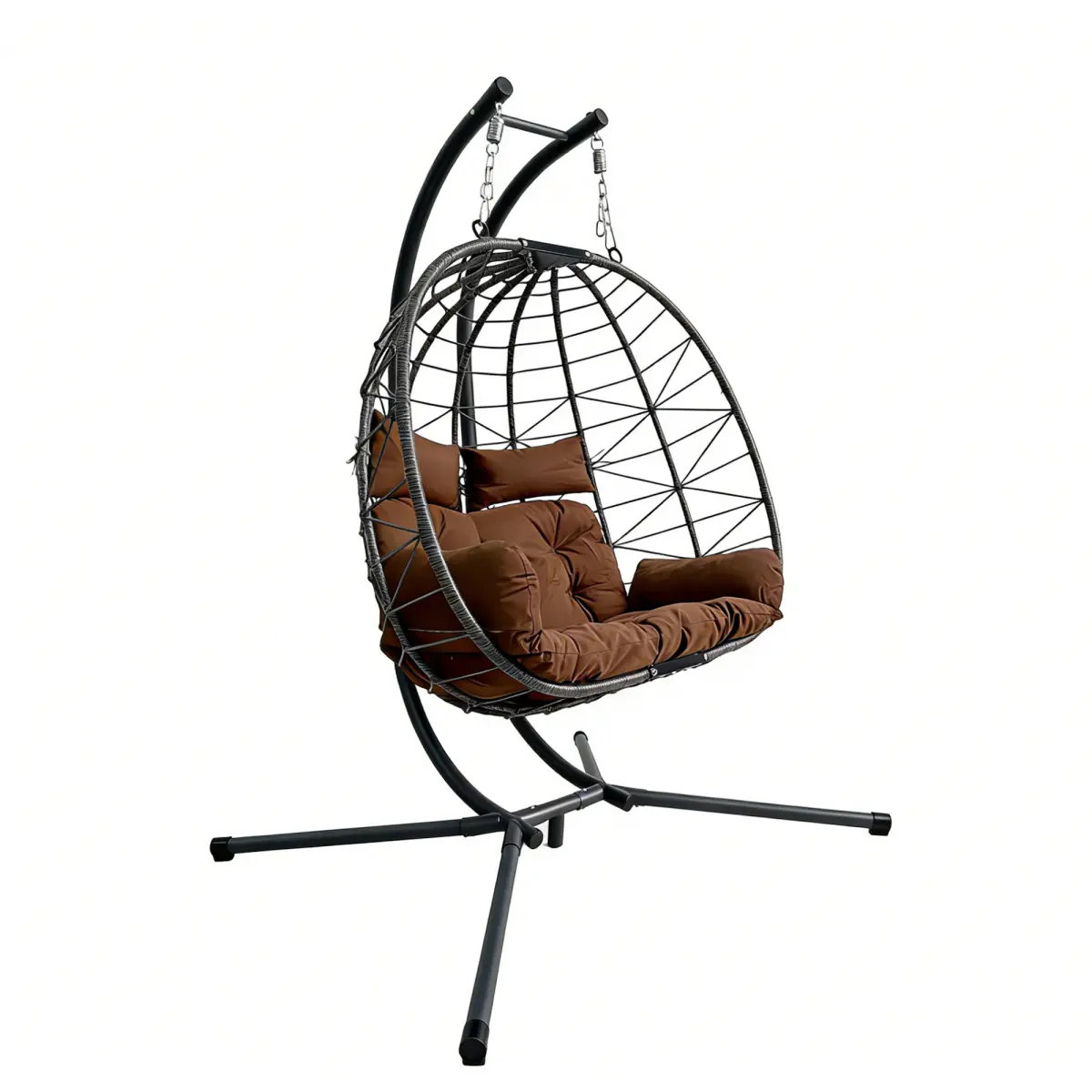 ·Product Specifications Color: BrownSize: Basket 50.39" L * 43.31" W * 33.86" H; Overall 33.86" L * 50.39" W * 76.77" HShape: Extra large egg-shaped double hanging swing chair with supporting standMaterial: All-weather PE rattan, powder-coated iron frame, polyester cotton-filled cushions Extra Large 2-Person Seating This oversized double hanging egg chair is specially designed for two people, providing spacious and comfortable seating space.It offers plenty of room for relaxing, chatting, playing games or resting with family, partners or pets. Sturdy & Stable Construction Built with a heavy-duty powder-coated iron frame and wrapped with premium all-weather PE rattan, this swing chair features strong stability, water resistance and long durability.The solid structure ensures safe and steady use for both indoor and outdoor environments. Ultra Comfortable Cushion Set Equipped with large plush seat cushions and soft headrest pillows filled with cotton, the chair delivers exceptional comfort and support.Cushions are fixed with durable ties to avoid shifting, perfect for reading, napping and daily leisure. Stylish Boho-Modern Design With an elegant boho-modern appearance, this double swing chair enhances the decor of any space.It is ideal for patios, balconies, gardens, backyards, living rooms, bedrooms, poolside, cafes and resorts. Easy Assembly & Space-Saving Storage The package includes complete tools, hardware and clear instructions.Assembly can be finished within 20–40 minutes with the guide.The detachable basket design allows compact storage when not in use. Versatile Indoor & Outdoor Use This weather-resistant loveseat swing chair works perfectly for all indoor and outdoor scenes, creating a cozy leisure corner and adding a warm, unique atmosphere to your home and outdoor areas. # DoubleHangingEggChair # 2PersonSwingChair # PatioHammockChair # PEWickerSwing # IndoorOutdoorLoveseat # BalconyGardenFurniture # BrownHangingChair # EasyAssembleSwing