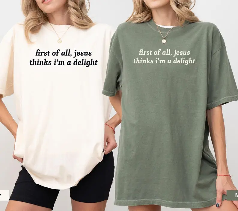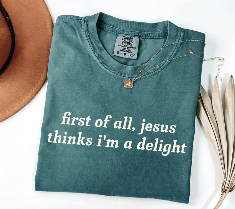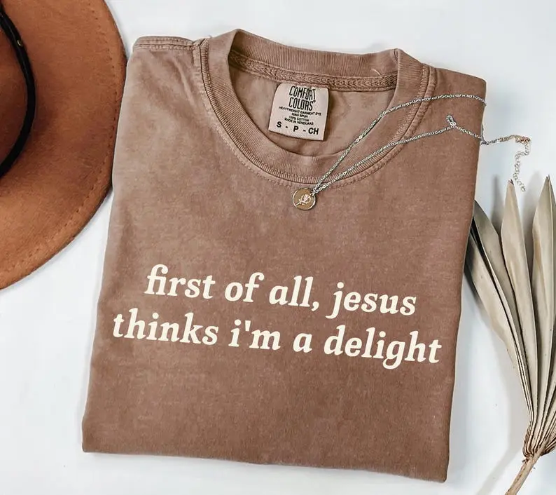 Add a little joy and humor to your faith with this “Jesus Thinks I’m A Delight” T-Shirt ️. Featuring a lighthearted and uplifting message, this tee blends Christian faith with a soft, minimal aesthetic.