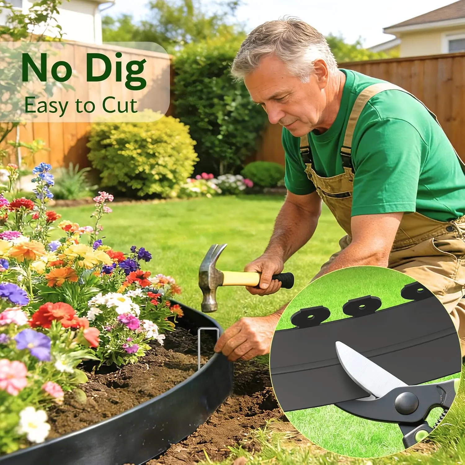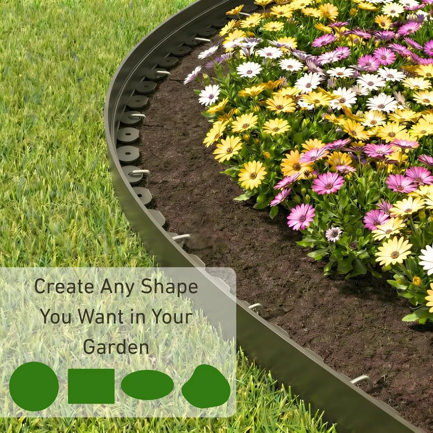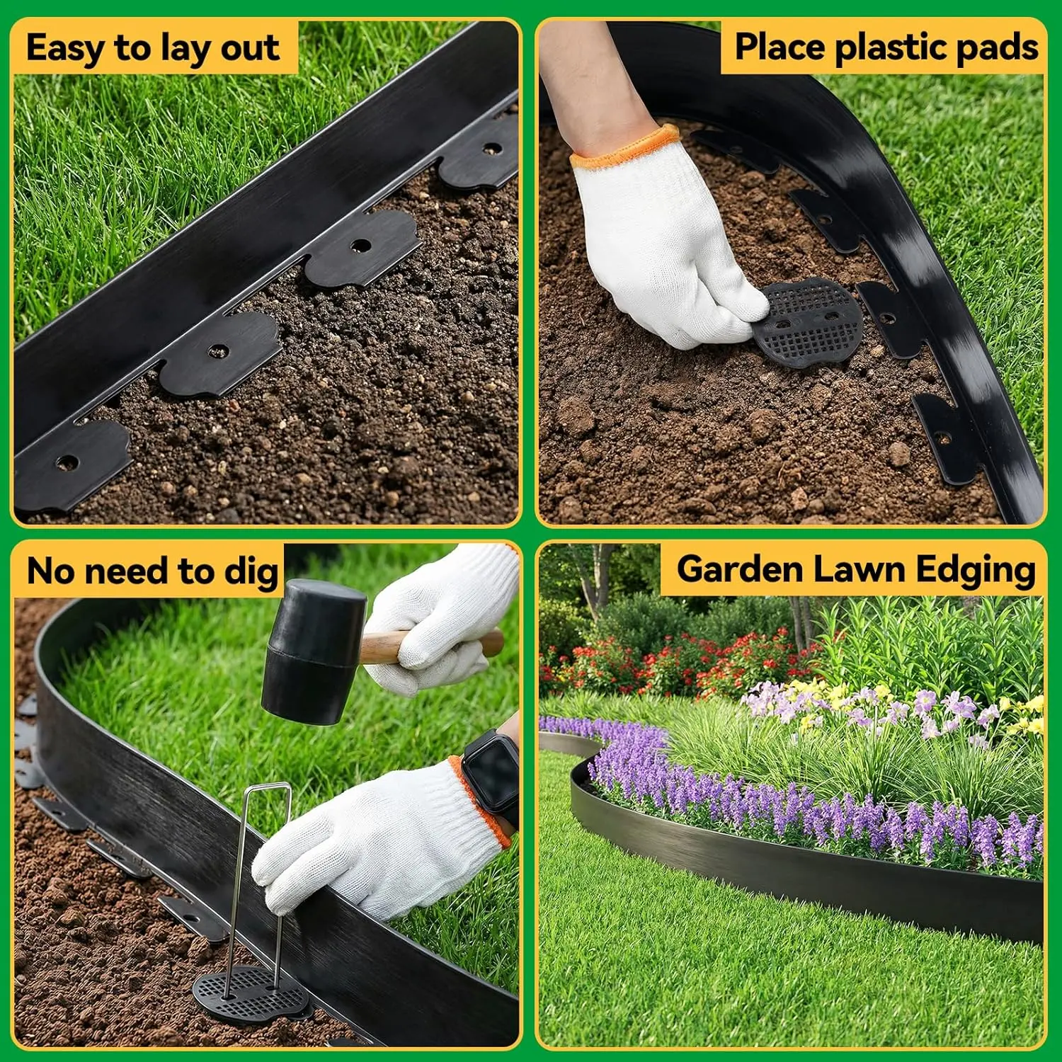 EFFORTLESS NO-DIG INSTALLATION: Simply lay the edging along your desired border, hammer in the metal stakes through the pre-formed slots, and you're done. No trenching, no digging, no special tools required. The flexible design bends easily to create smooth curves or crisp straight lines, while the 4/3/2/1.5-inch height provides ample barrier depth to contain mulch, soil, and plants. Plus, the visible border protects your plants from accidental lawnmower and trimmer damage .