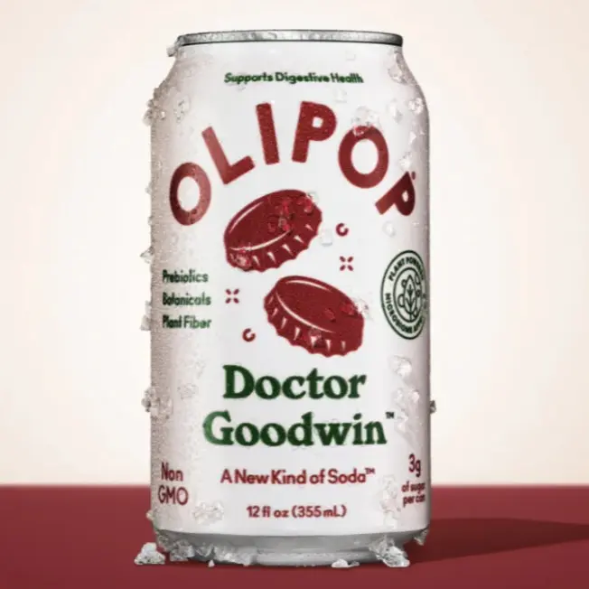 OLIPOP Doctor Goodwin blends plum, prune, tart cherry, and vanilla for a deep, spiced soda flavor.