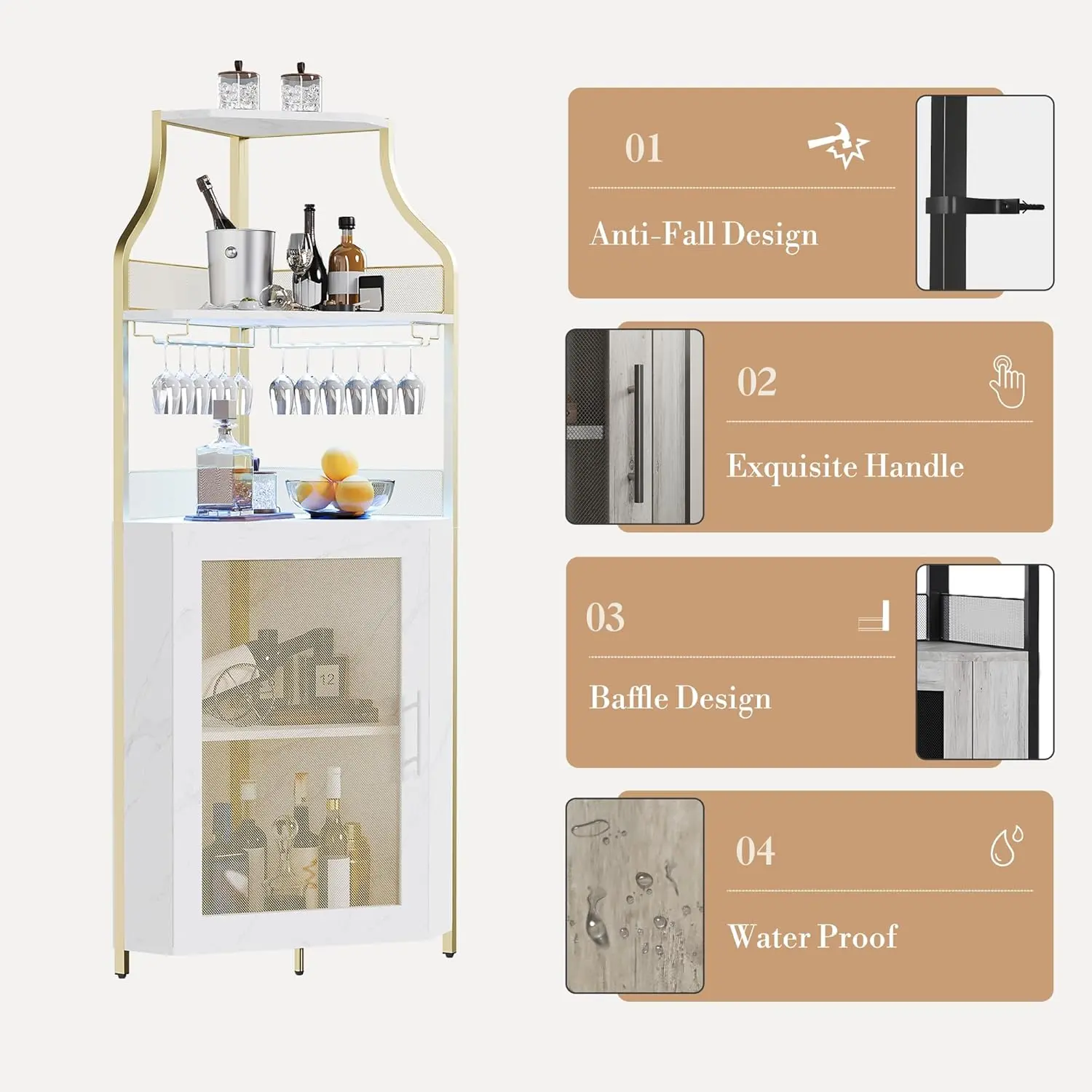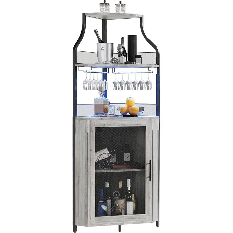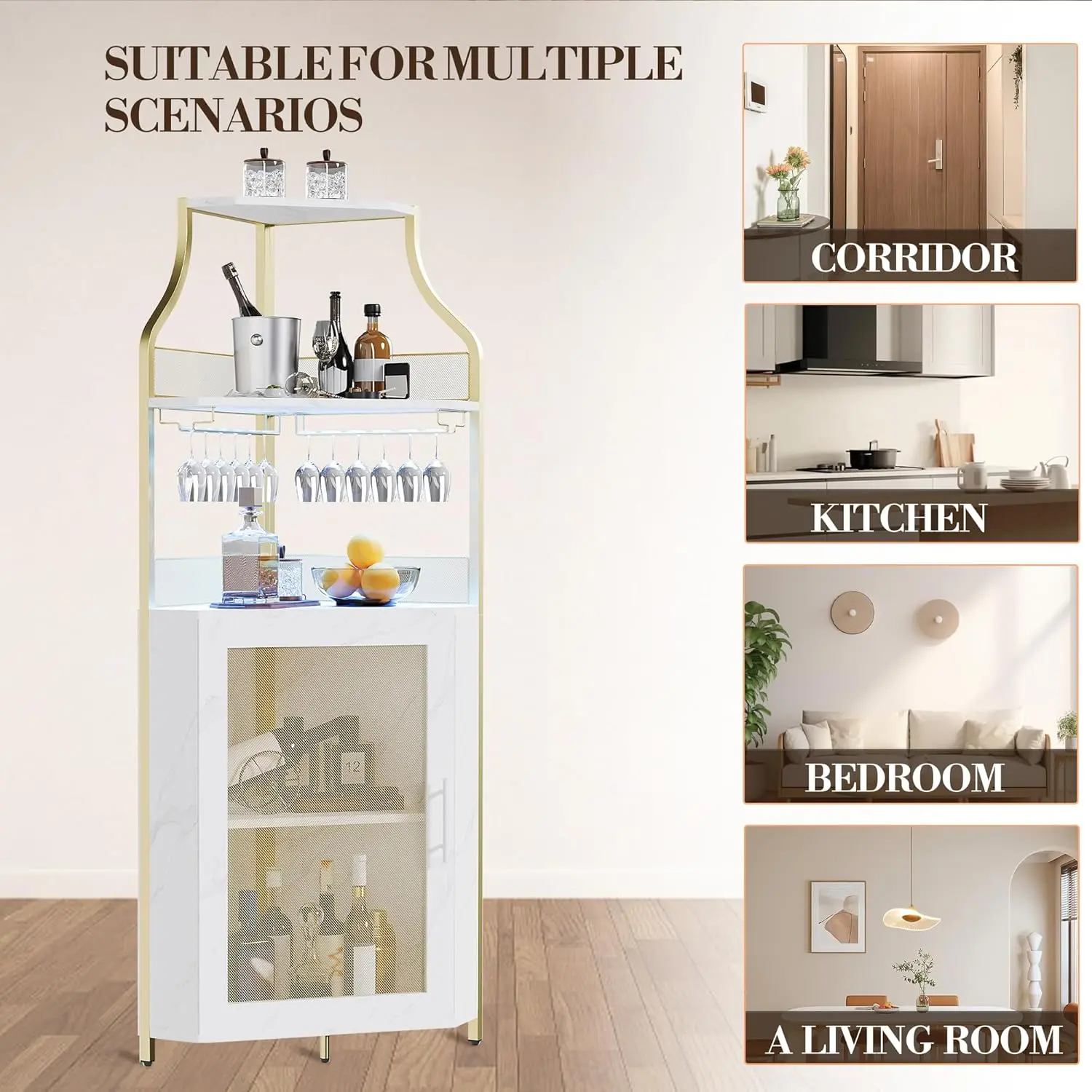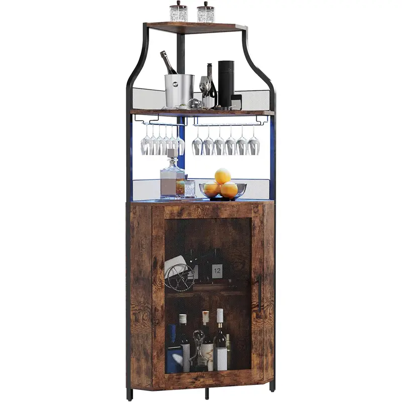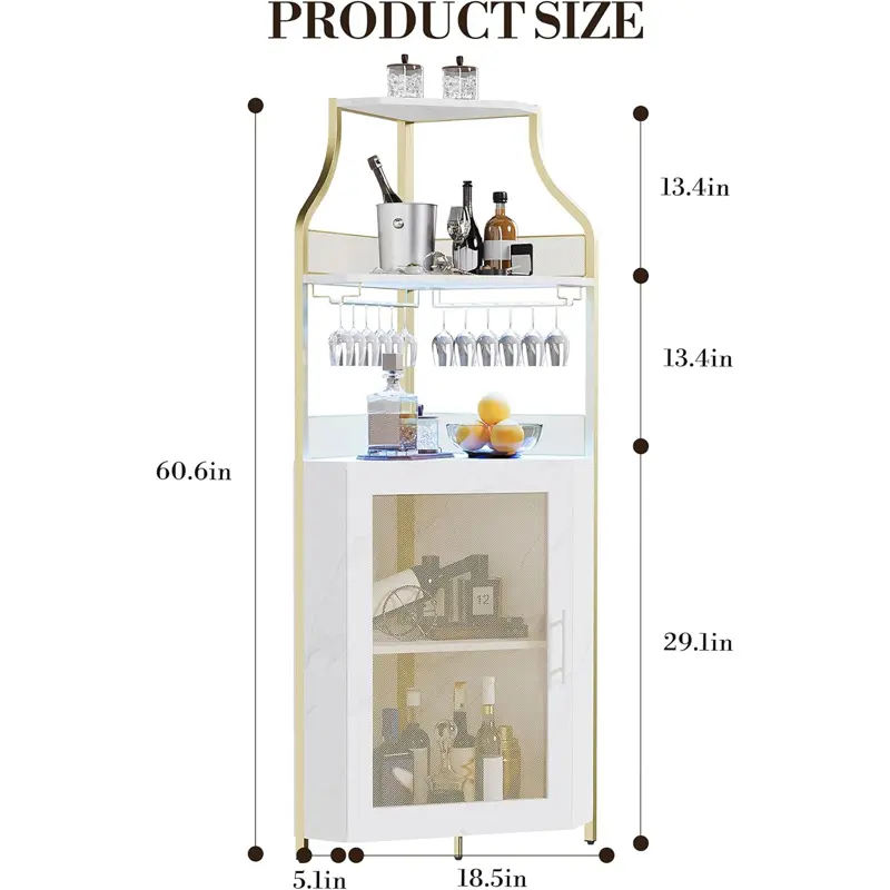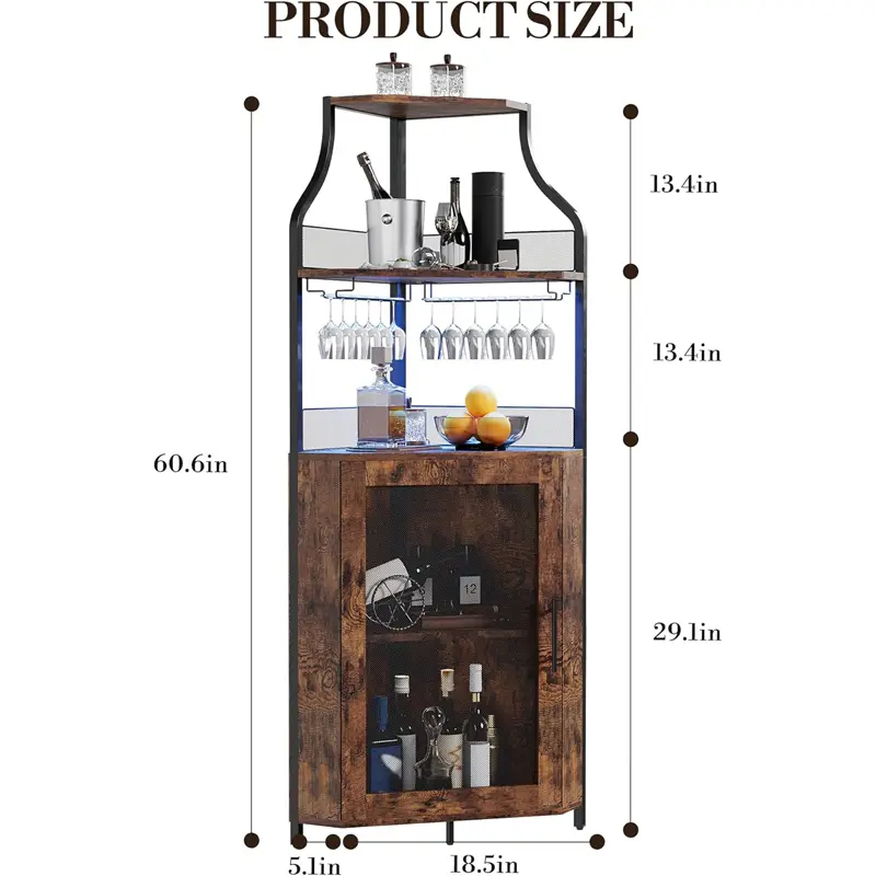 5-Tier Corner Bar Cabinet with LED Lights – Wine & Liquor Storage Sideboard – Adjustable Shelves, Removable Glass Rack, Mesh Door, Glass Holder – Dining Room Buffet