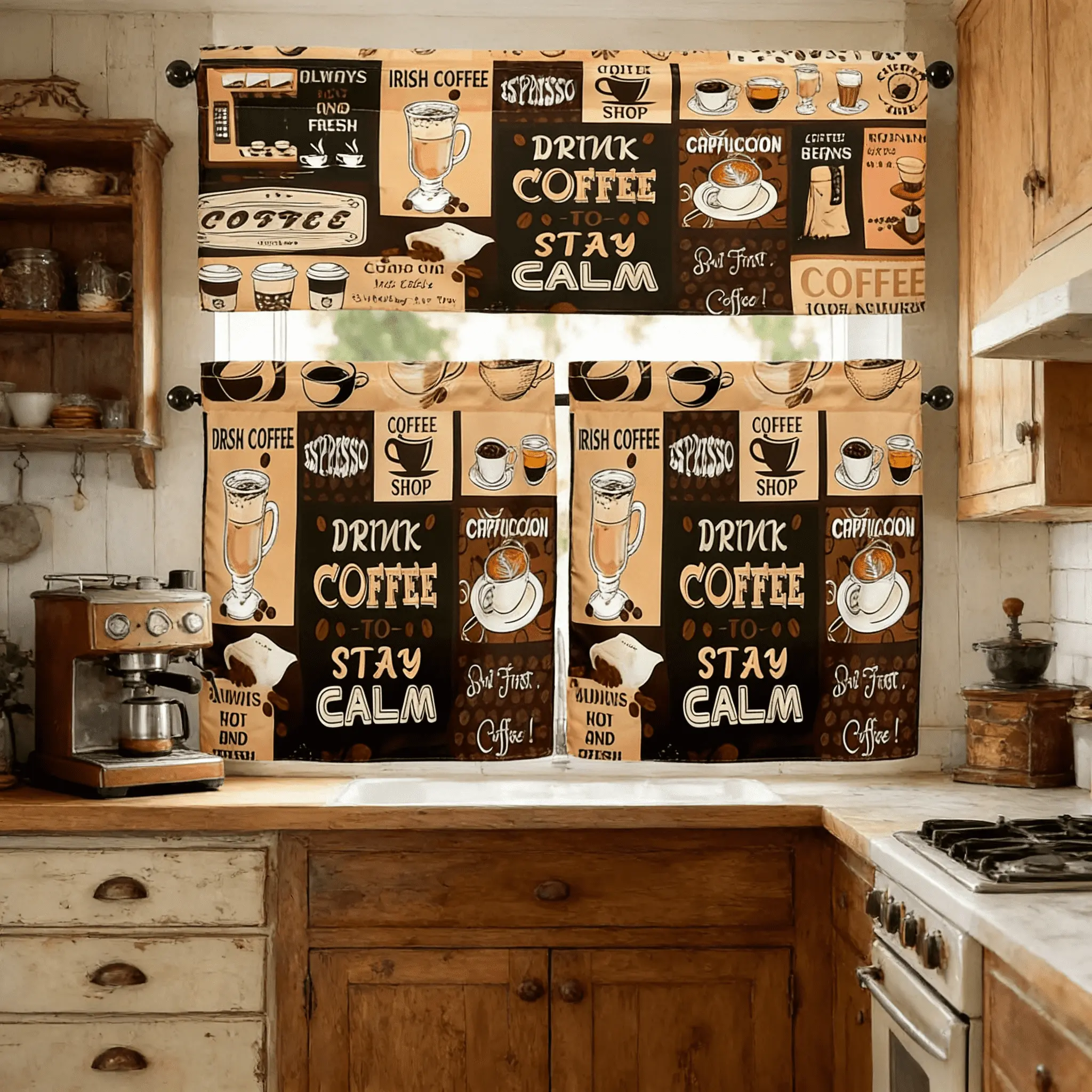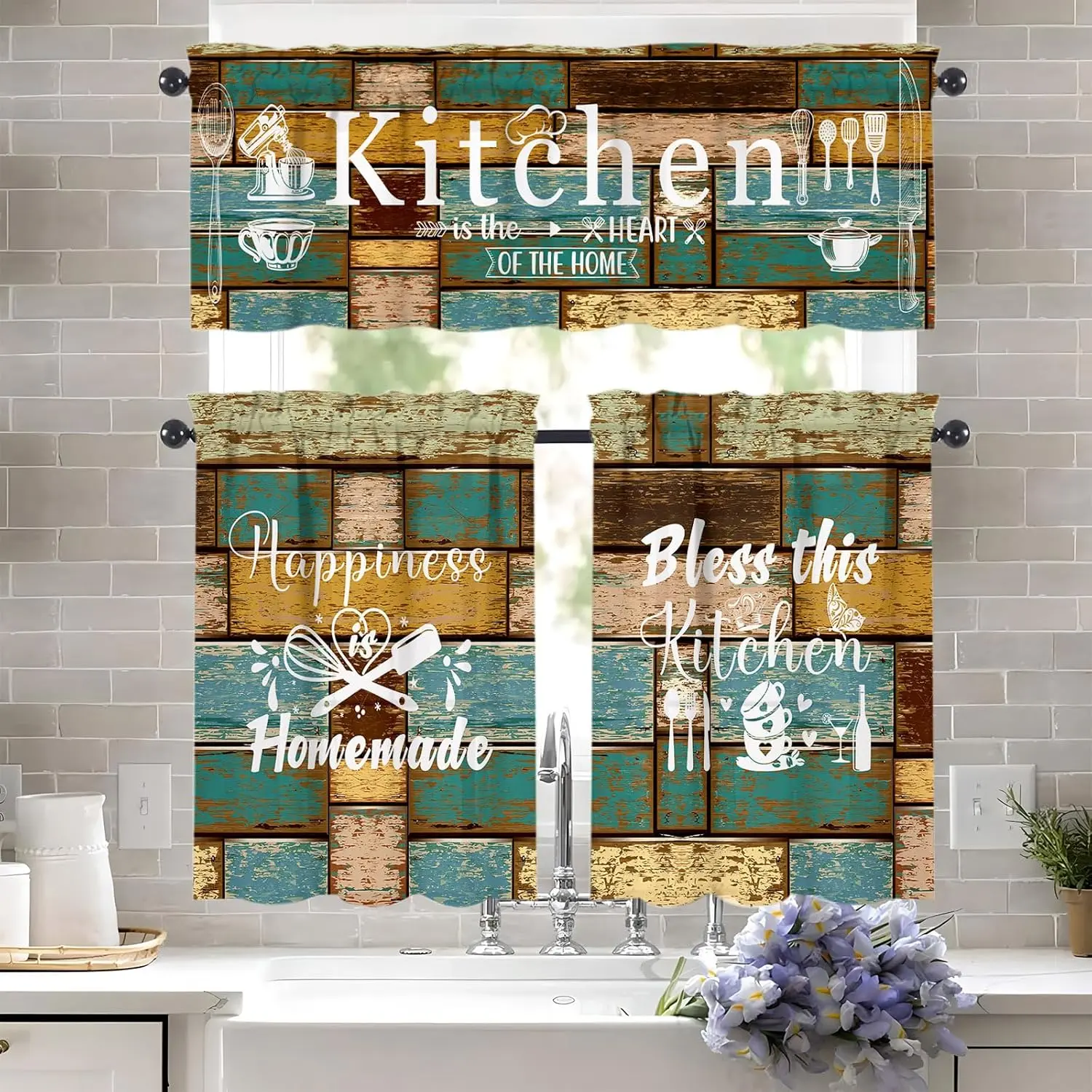 SoftHaven Home Made in USA Vintage Rustic Farmhouse 3-Piece Kitchen Curtains & Valances Set, Elegant Country Style Rod Pocket Window Drapes, Reusable Washable Polyester Home Decor for Kitchen Windows