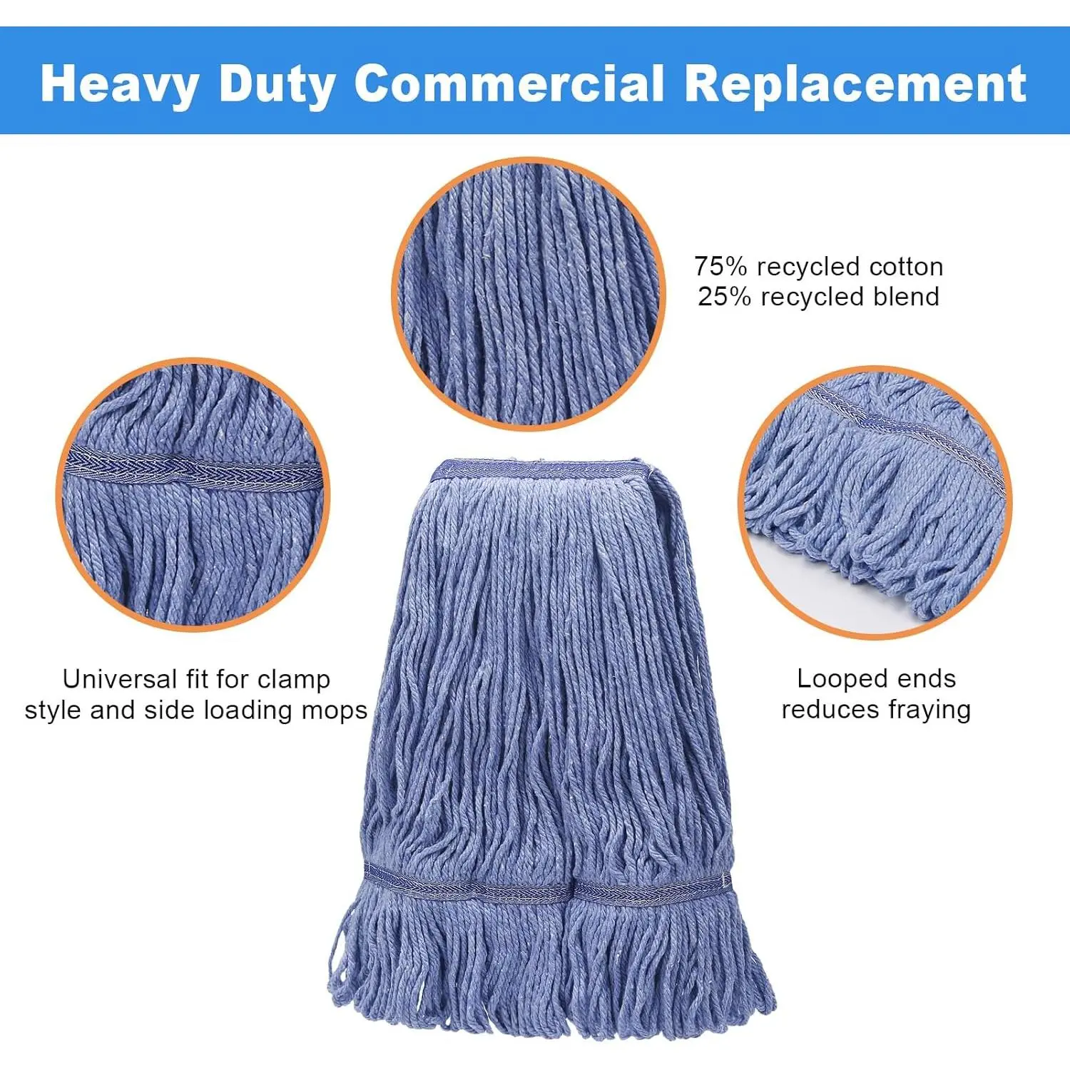 ·Commercial Replacement Loop Mop Heads, Light Blue, Pack of 2.Suitable for both wet and dry use, the cotton mop head is highly absorbent and will not damage floors, resulting in no scratches.