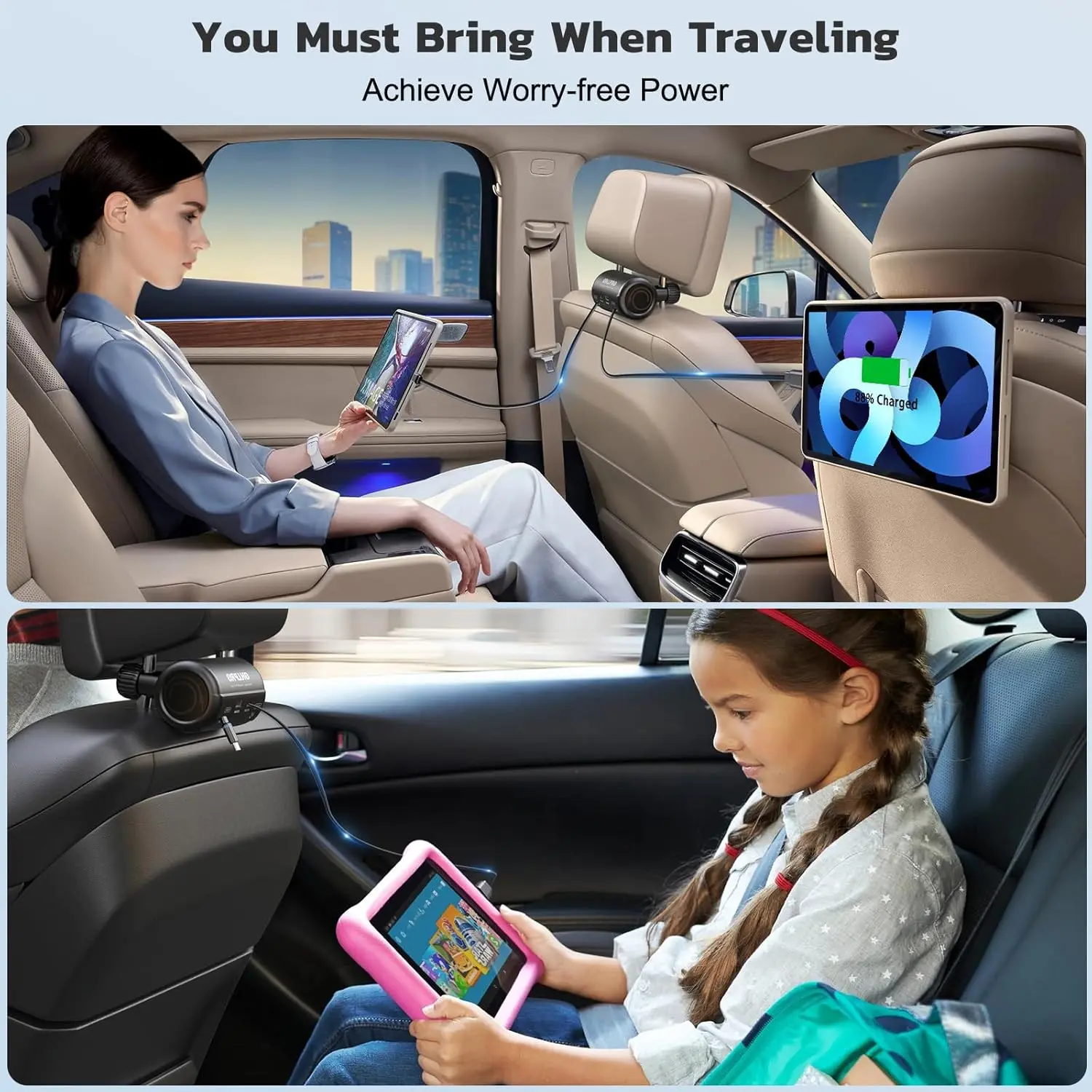 OHLPRO Car Back Seat Charger with Retractable Cables, Headrest Mount Phone Tablet Charger with USB-C PD30W & iOS PD20W Wires, 4-Port Adapter for Uber Taxi Rideshare, with Cigarette Lighter Plug