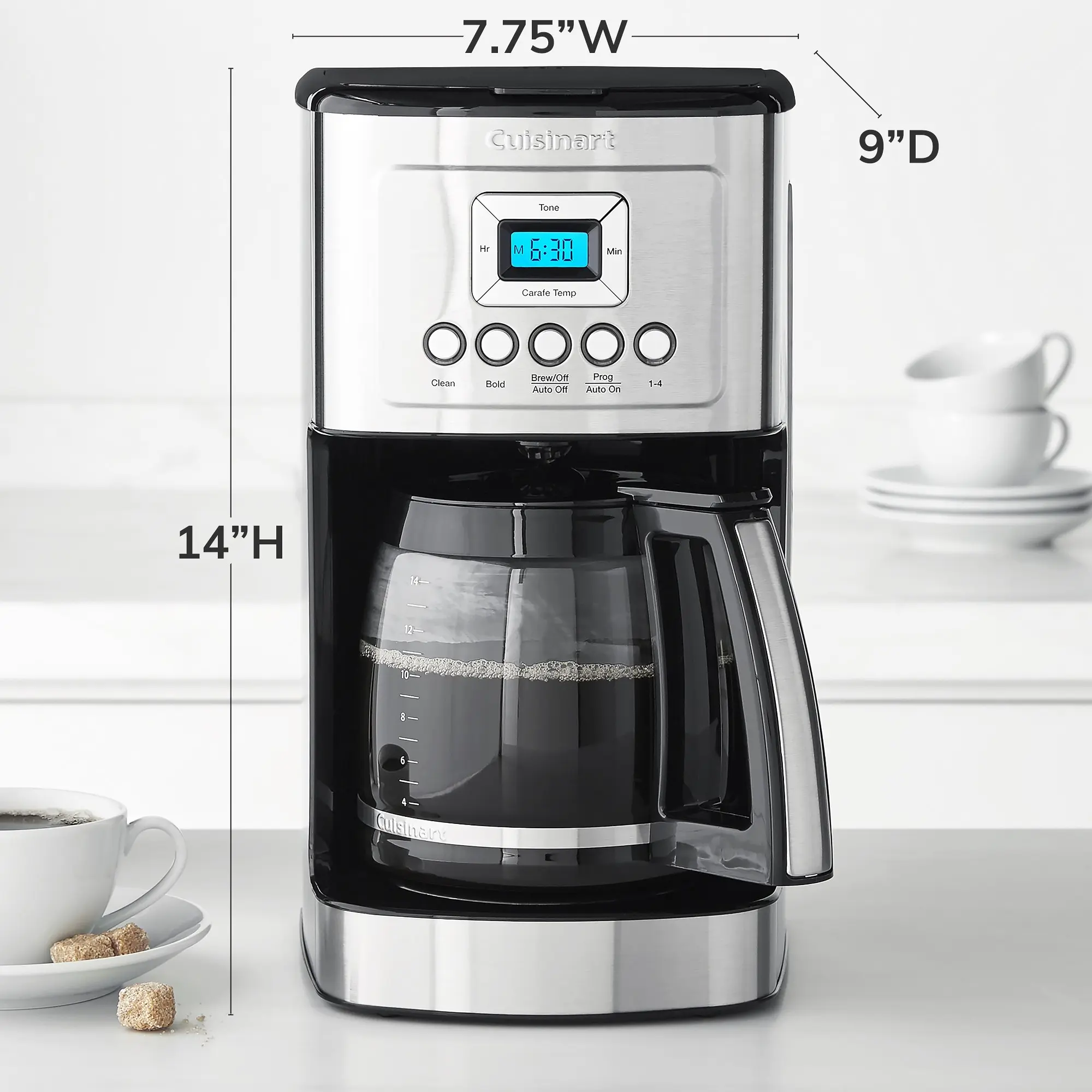 ·Generous 14-cup glass carafe with plastic handle.