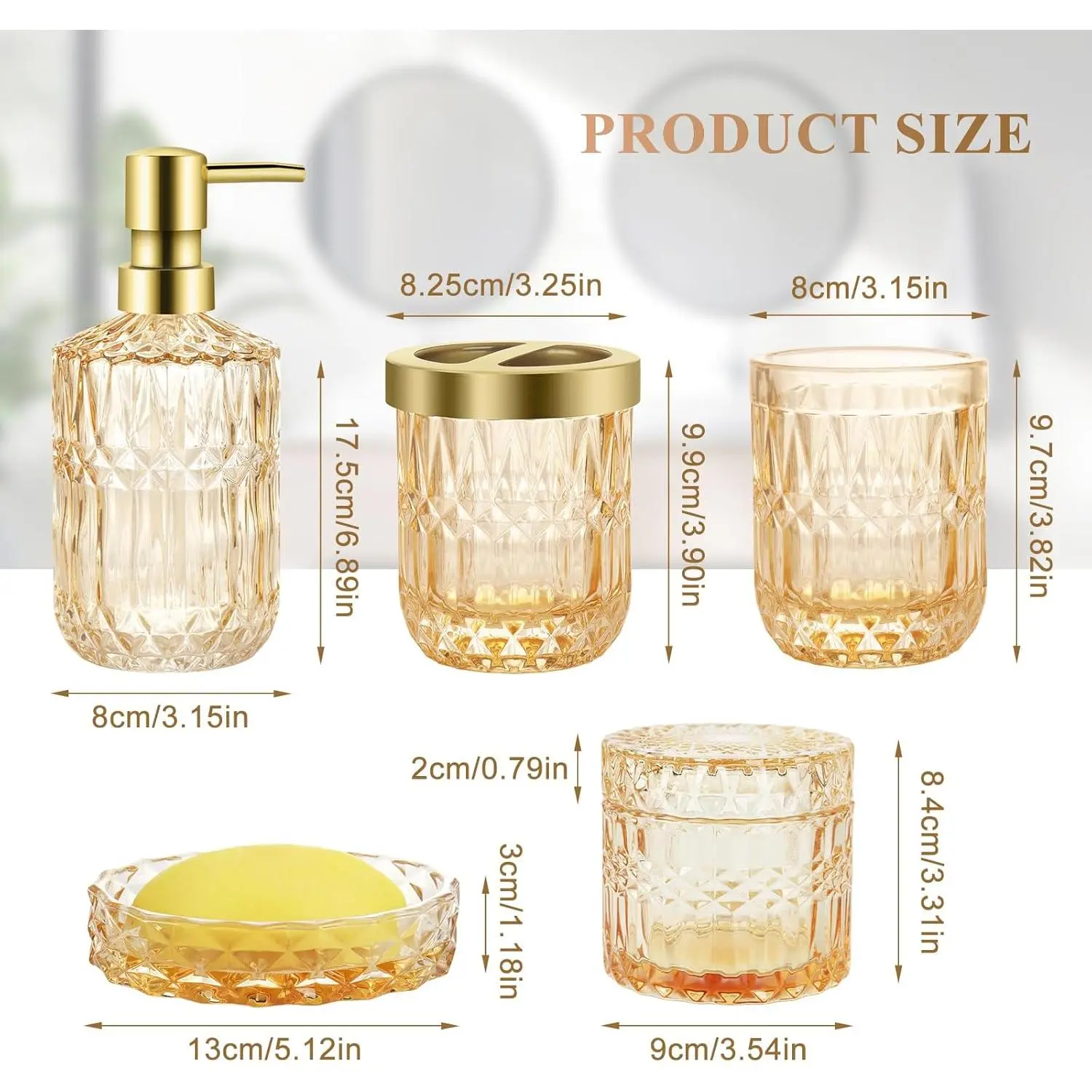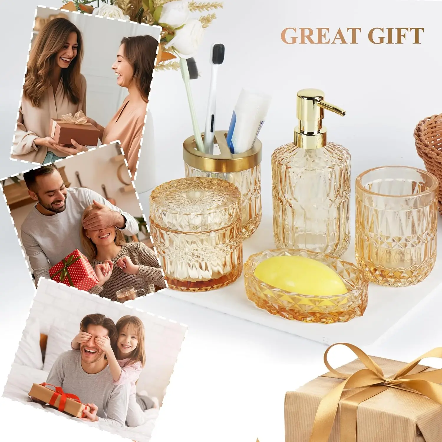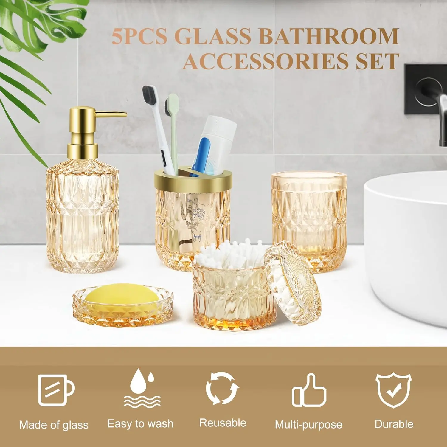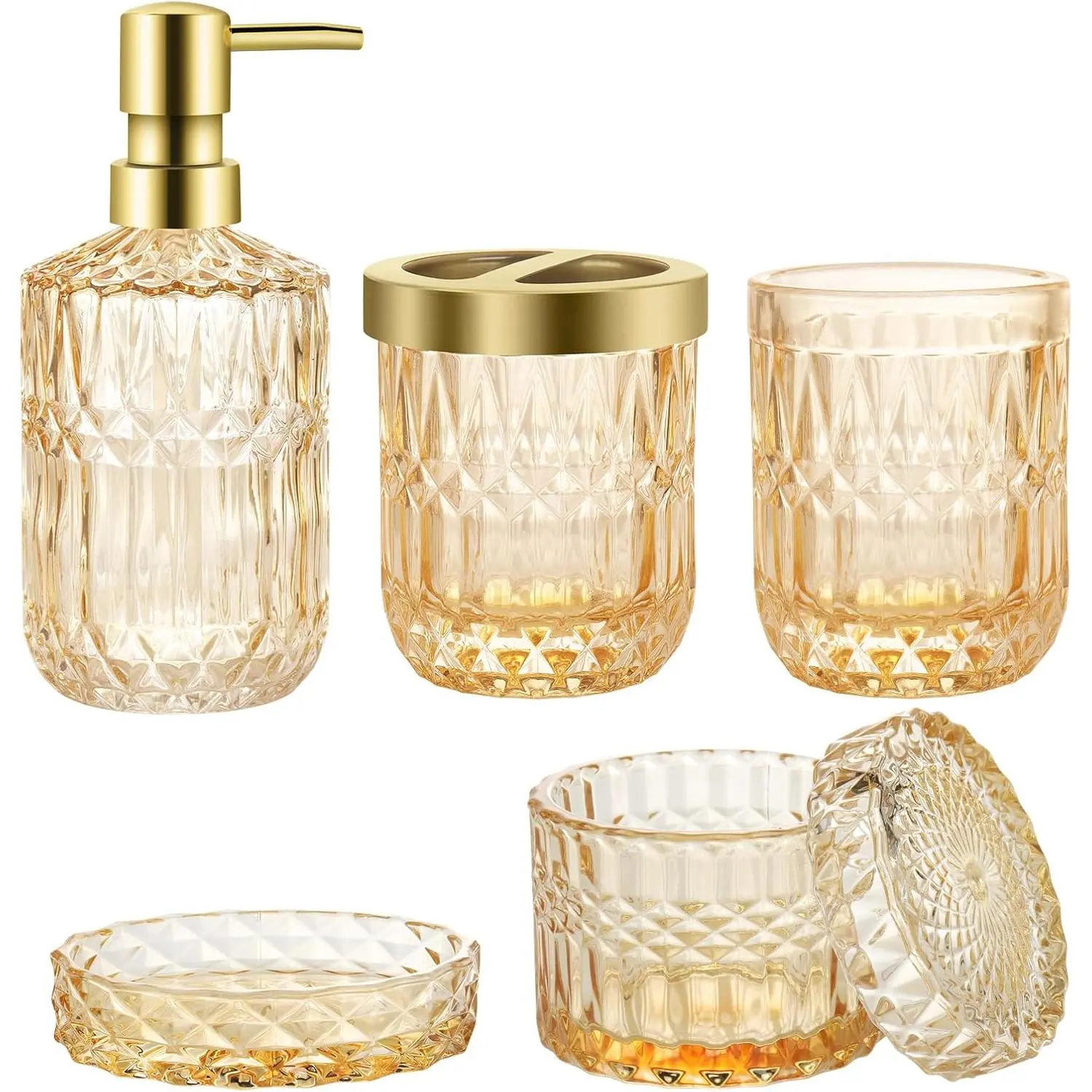 Bathroom Accessories Set, 5Pcs Gold Glass Bathroom Accessories Set with Gold Soap Dispenser, Soap Dish, Toothbrush Holder, Tumbler, Cotton Swab Jars