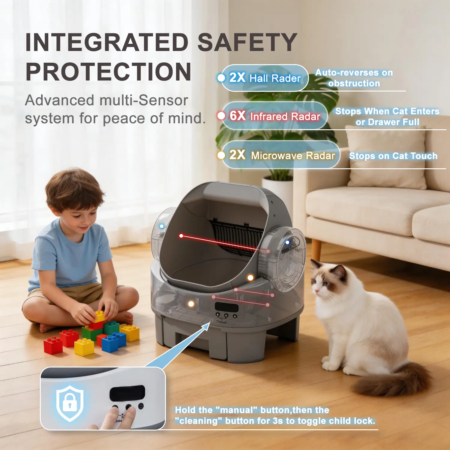 Built with 3 infrared sensors, 2 microwave radars, and dual hall sensors. The unit automatically pauses or reverses if your cat approaches during cleaning, safely protecting paws, tails, and small bodies from pinching or harm.