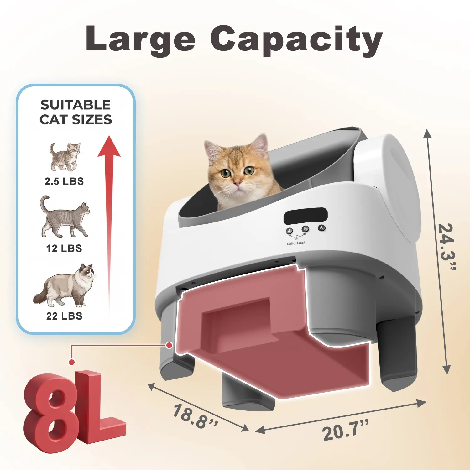 Extra‑large 8L sealed waste drawer holds waste for up to 10 days for a single cat. Less frequent emptying means more freedom for work, short trips, or vacations.