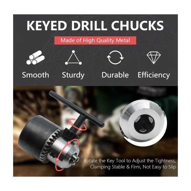 【Superior Workmanship】The Impact Drill Driver Bits equipped with chuck key, you can adjust the chuck to a reasonable tightness for higher precision. The key type drill block has polished surface, which is anti-corrosion and anti-oxidation, with stable performance and can be used for a long time. The drill chuck with universal keyed 3-jaw design can firmly fix various drill shanks.