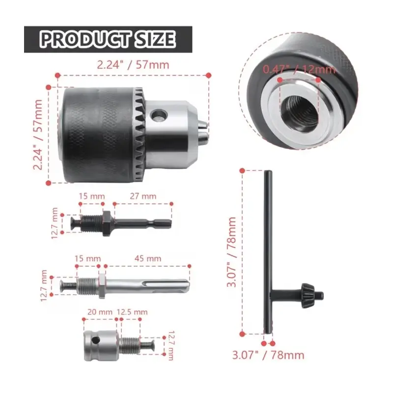 【What You Will Get】1 x Drill Chuck + 1 x Chuck Key + 1 x SDS-Plus Shank+1 x 1/4 Inch Hex Shank +1 x 1/2 Inch Square Female Socket Adaptor . Mount thread: 1/2"-20 UNF, clamping range: 1/16" - 1/2" / 1.5 - 13mm. The Key Drill Chuck is made of high quality metal casting, can withstand a wide range of daily use, is a ideal drill conversion tool for daily life.