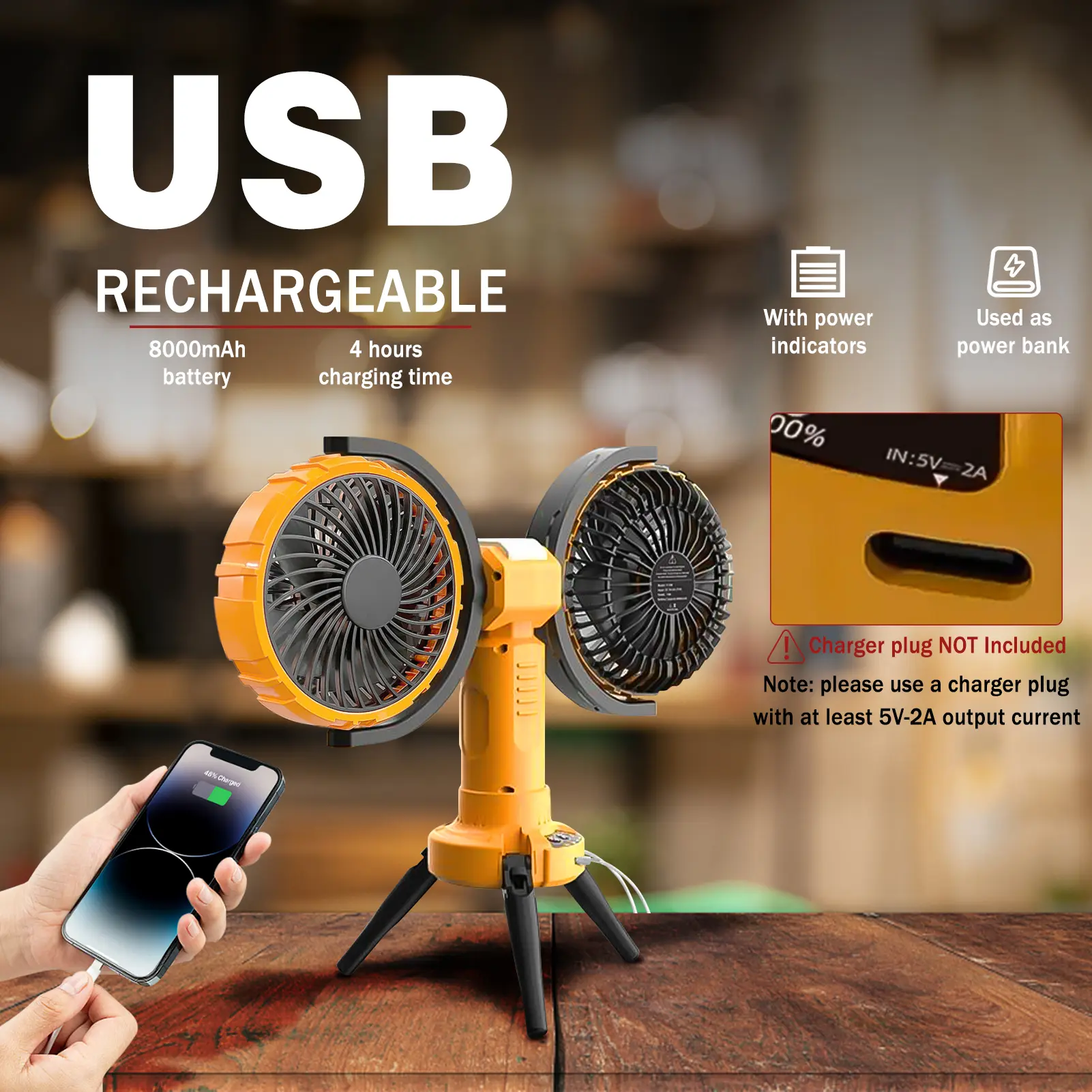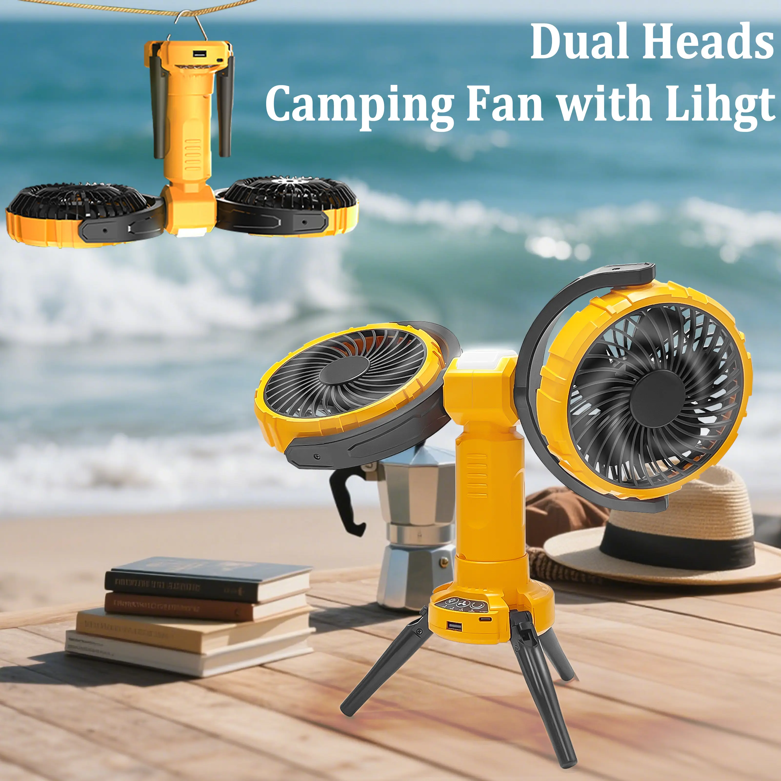 Dual-Head Wide-Angle Portable Fan with Light & Power Bank
