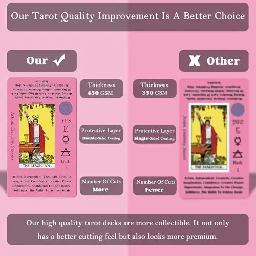 [Upgraded Material] - The paper used in our tarot is 450GSM. This is thicker than the common 350 GSM and 400 GSM tarot. This makes our tarot have better quality. Not only does it have a better cutting feel but it also has a more premium look and feel. It can be shuffled many times without deformation and damage.