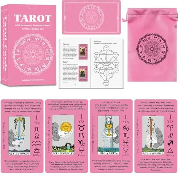 [Tarot Set Includes] -This tarot set contains 4.72 in X 2.76 in (12 X 7 cm) 78 tarot cards. A paper guidebook with more detailed explanations, and the book also contains appendices such as elements, planets, constellations, chakras, etc. A pink color box. A matching pink velvet storage bag.