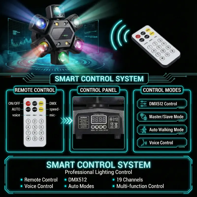 Operating Modes: DMX512, Master/Slave, Auto/Self-Walking, Voice-Activated