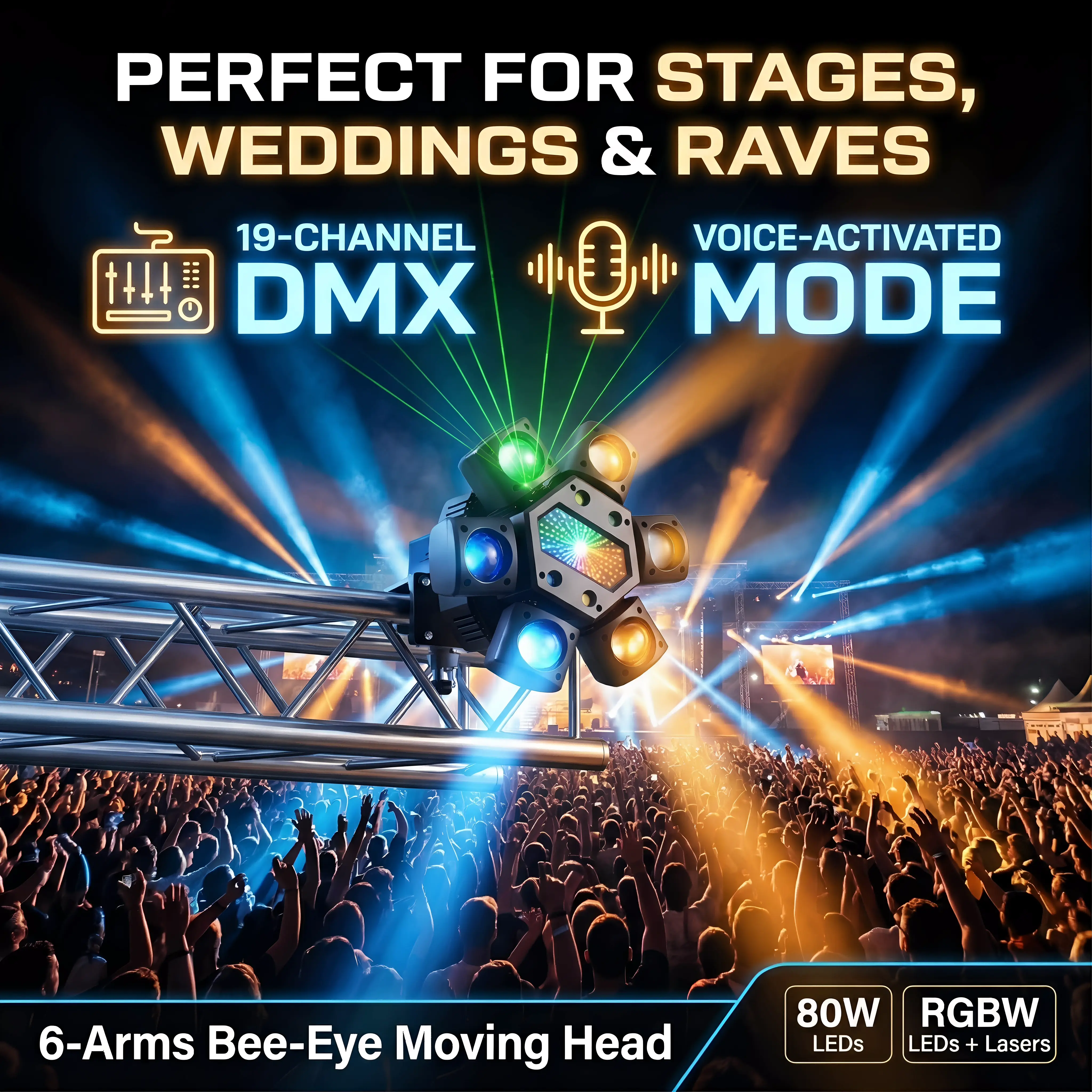 for stage shows, weddings, festivals, raves, clubs, and bars.DMX512 control allows professional-grade lighting for every setup.