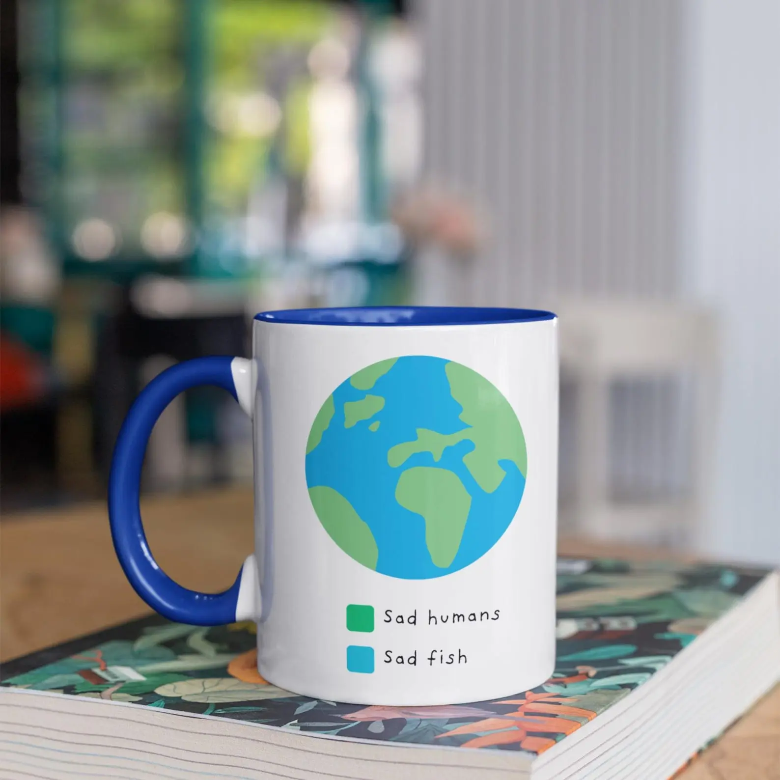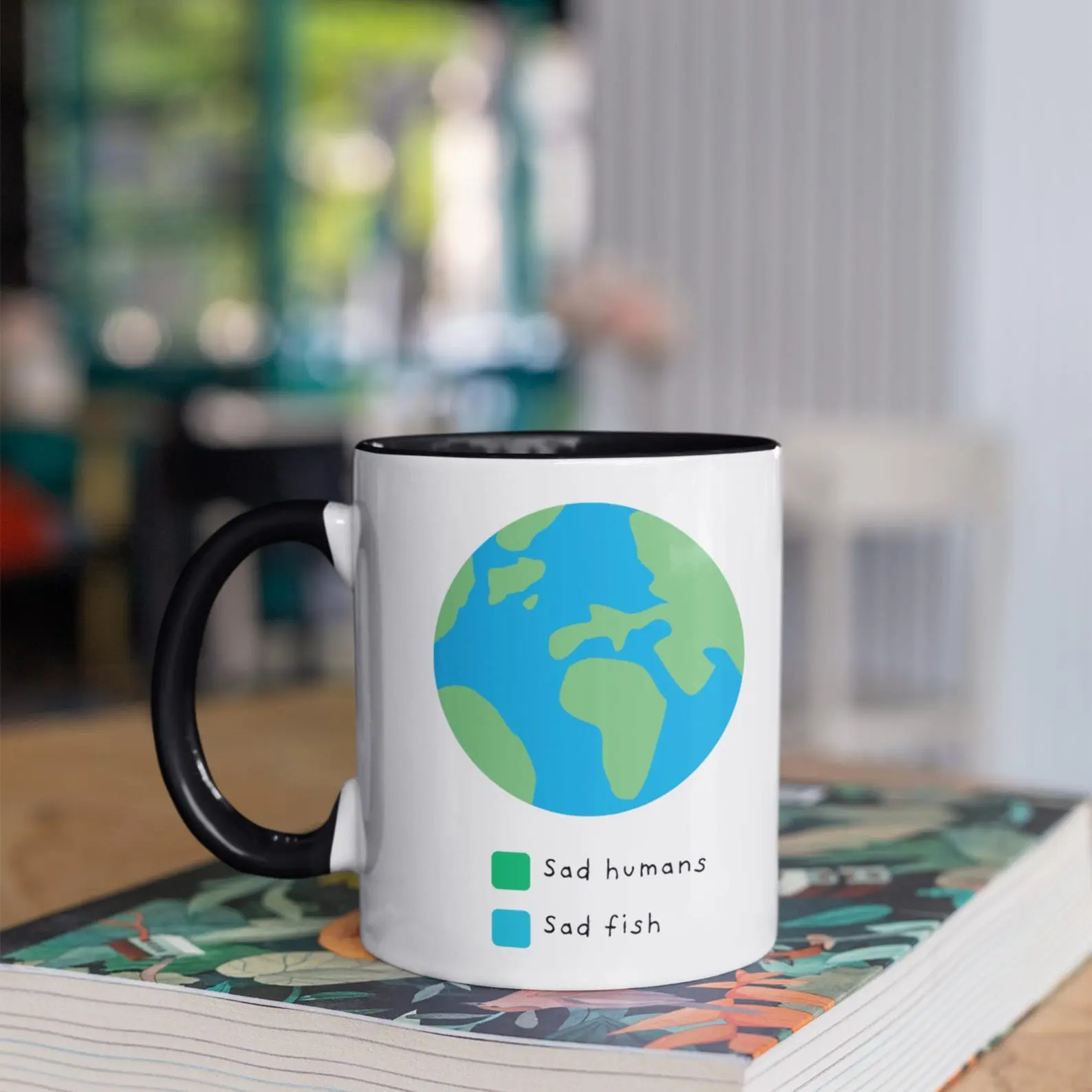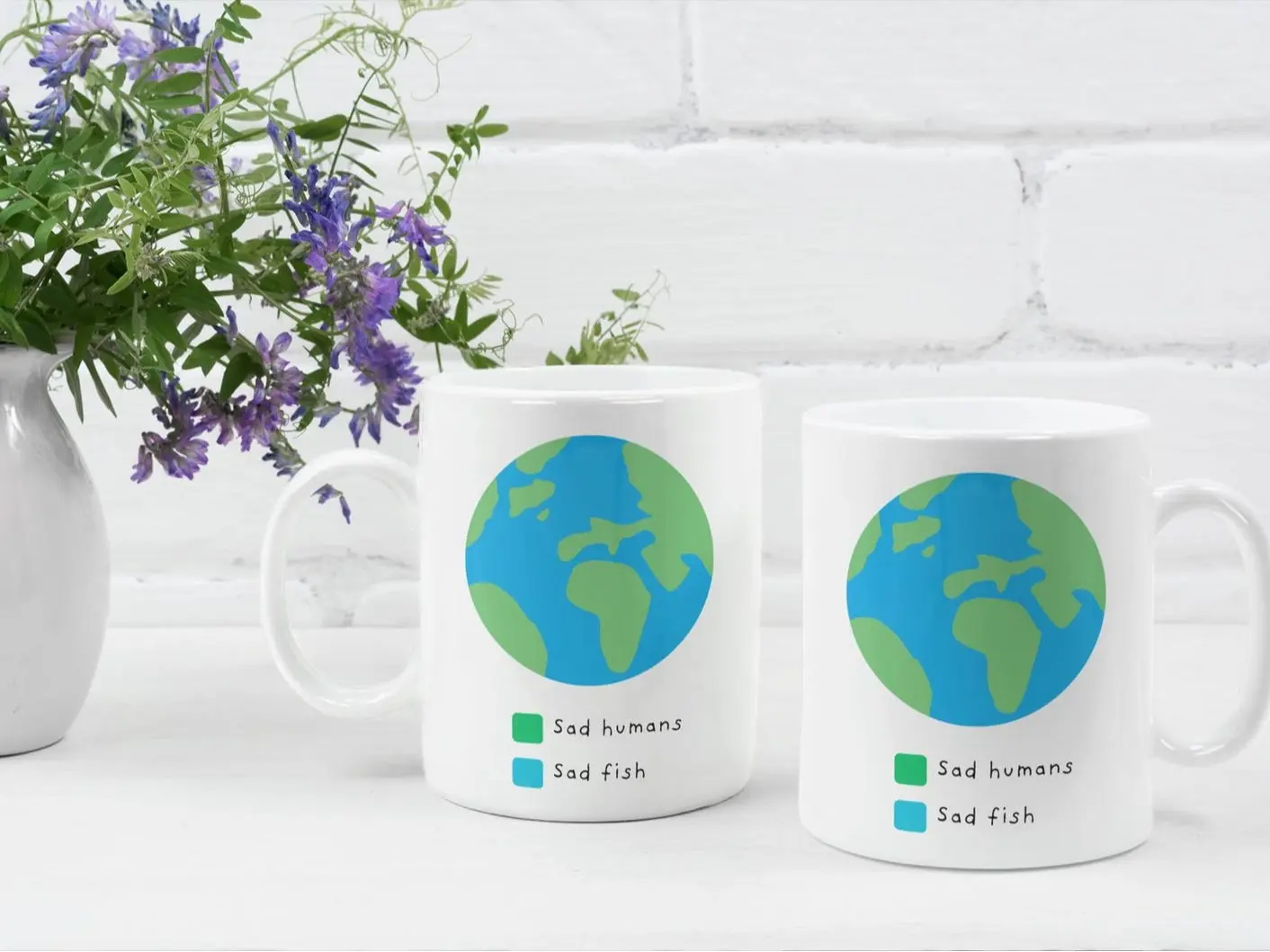 Two Earths, one truth. Green for us, blue for them — because sad humans and sad fish share the same planet. A bold, meaningful mug for those who actually give a damn.