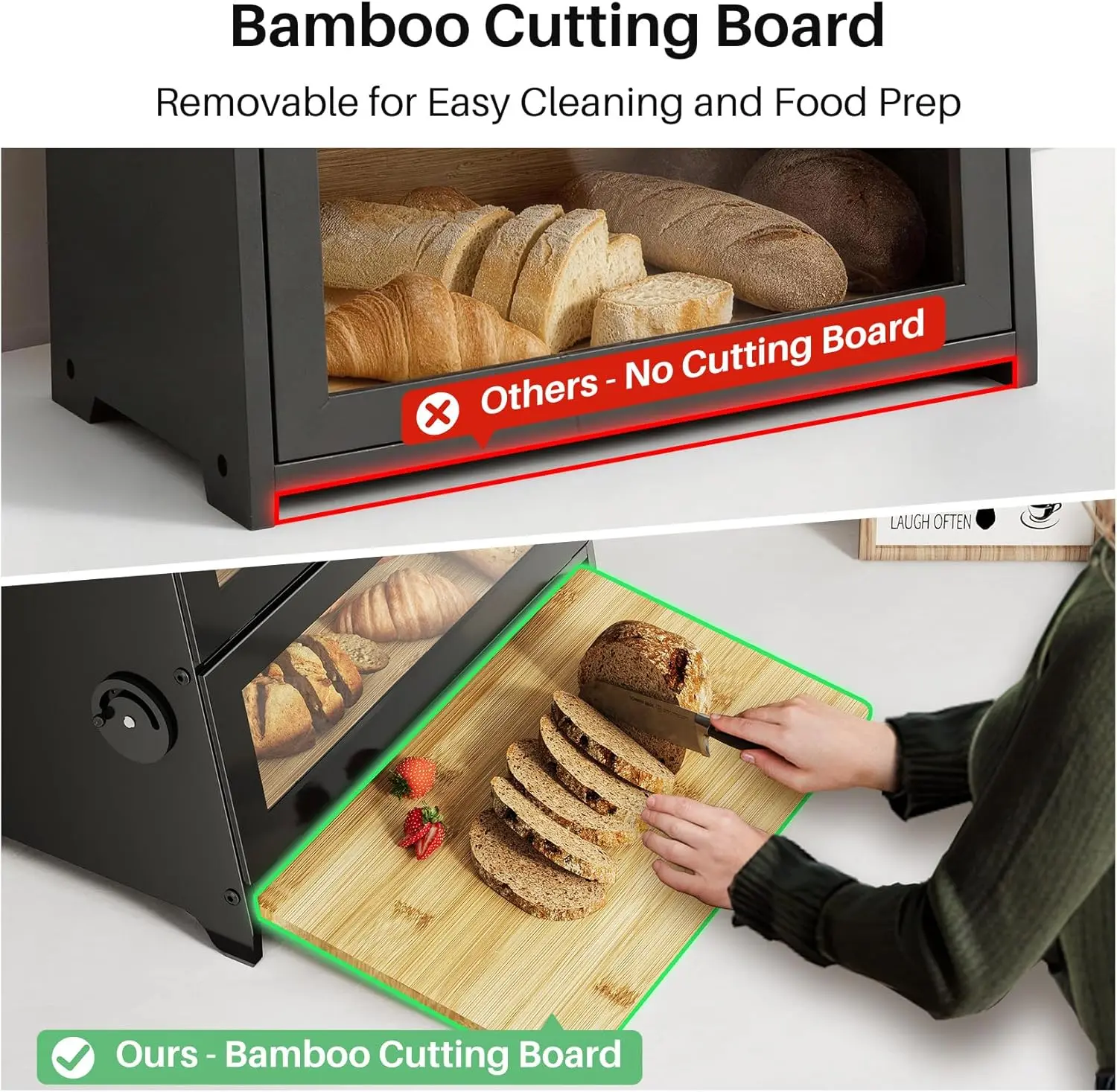·Removable Bamboo Cutting Board: The bread box includes a removable bamboo cutting board that adds extra value, allowing you to slice bread right where you store it. The lift-out design makes cleanup effortless, just wipe it clean with a cloth!
