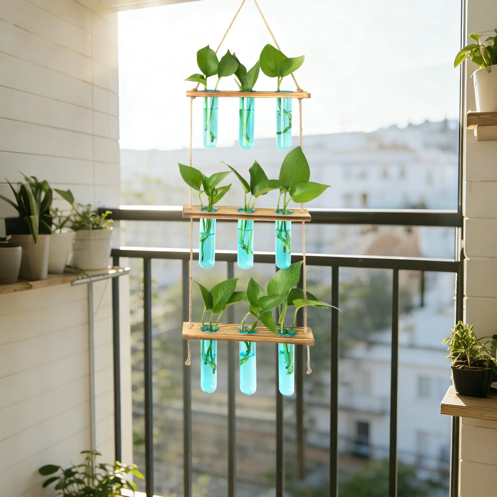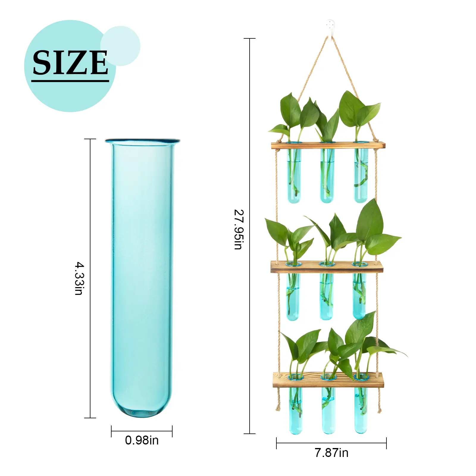 3-Tier Hanging Plant Propagation Station - Boho Wall Decor Wooden Planter with 9 Blue Glass Test Tubes