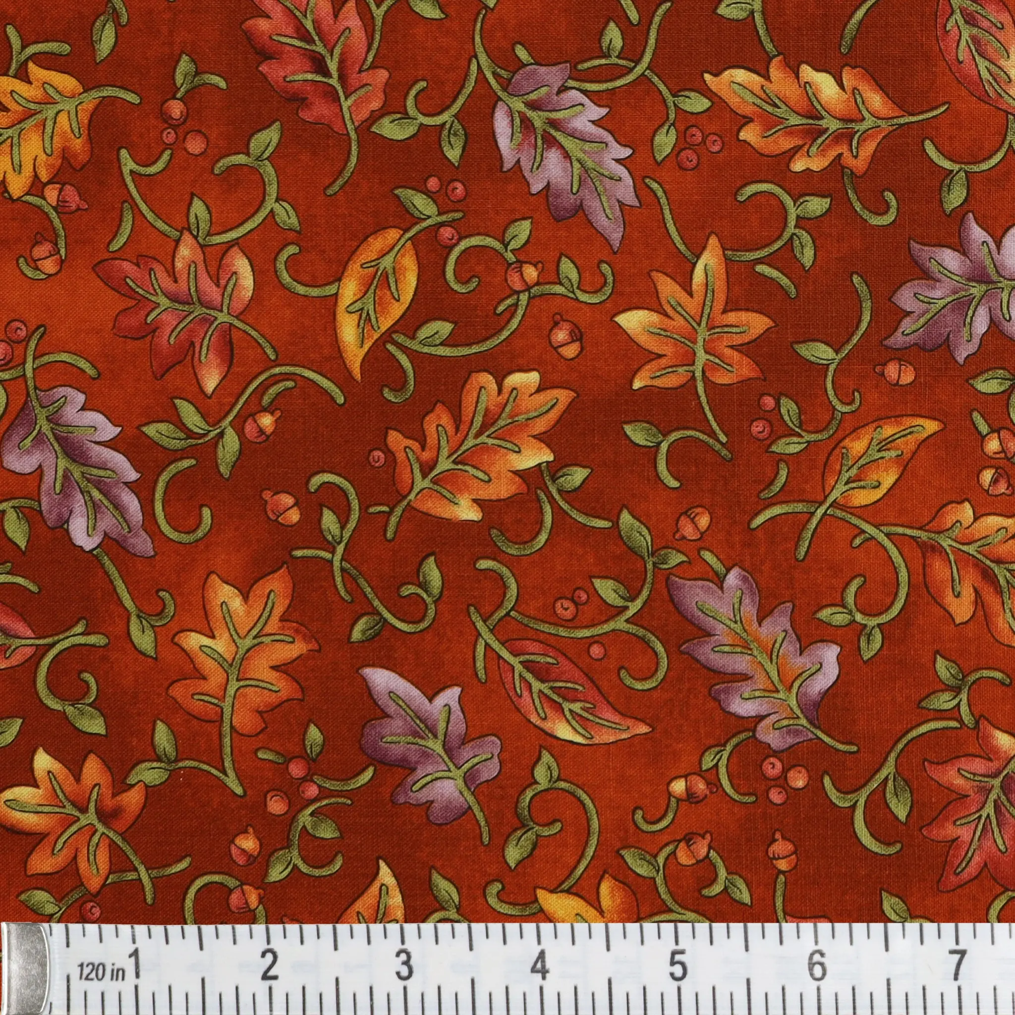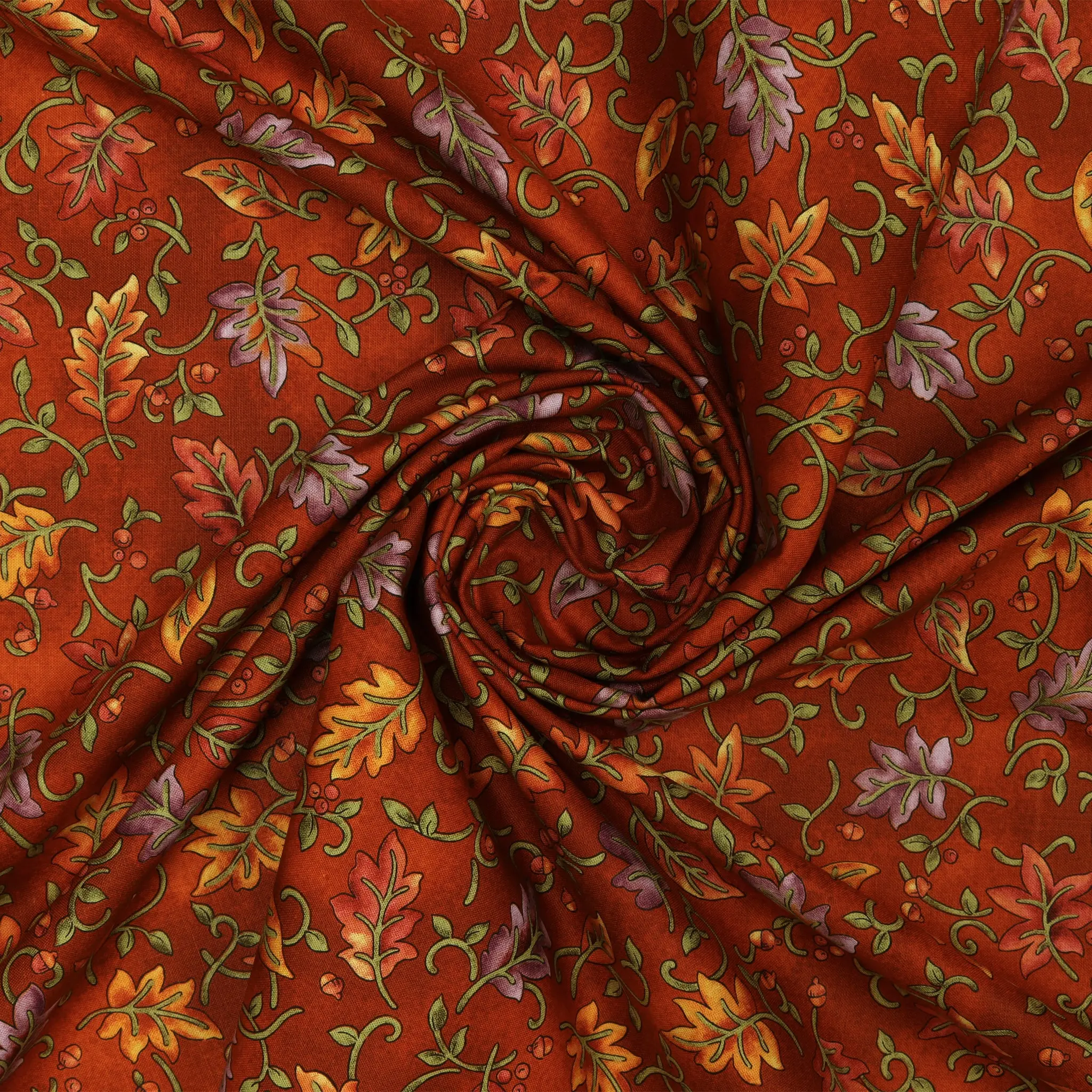 Bursting with color and energy, the pumpkin Dancing Leaves print captures the heart of harvest season. A lively orange base sets a festive tone while swirling vines and layered leaves in vibrant purples, warm reds, glowing yellows, and lush greens create a symphony of fall hues. This joyful print practically radiates warmth and is perfect for bringing a playful yet cozy touch to your seasonal makes. Whether you're crafting festive placemats, whimsical wall quilts, or piecing a cheerful throw, this print brings just the right amount of seasonal sparkle to your handmade creations.