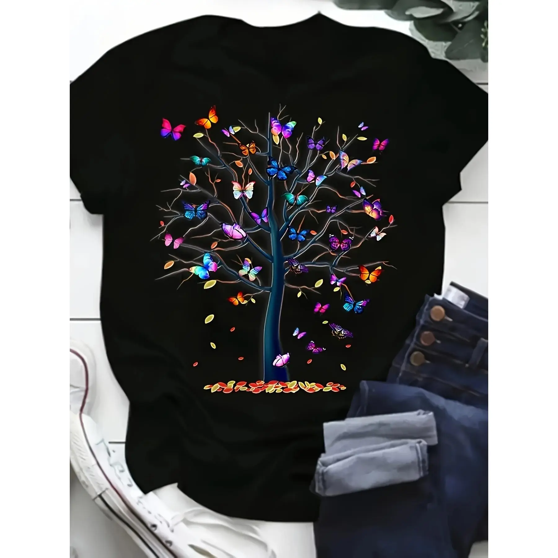 Butterfly Tree Print T-Shirt, Short Sleeve Casual Top For Summer & Spring, Women's Clothing