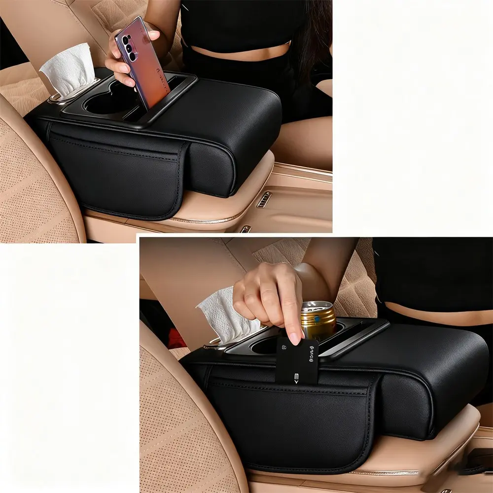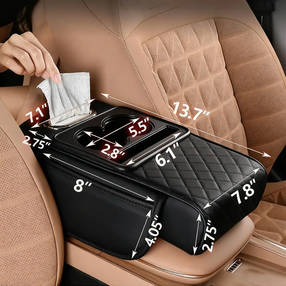 Our car armrest organizer integrates cup holders, card collectors, tissue boxes, and ample storage. It helps organize belongings and maximizes storage potential, enhancing the driving experience. Check the size before purchase.
