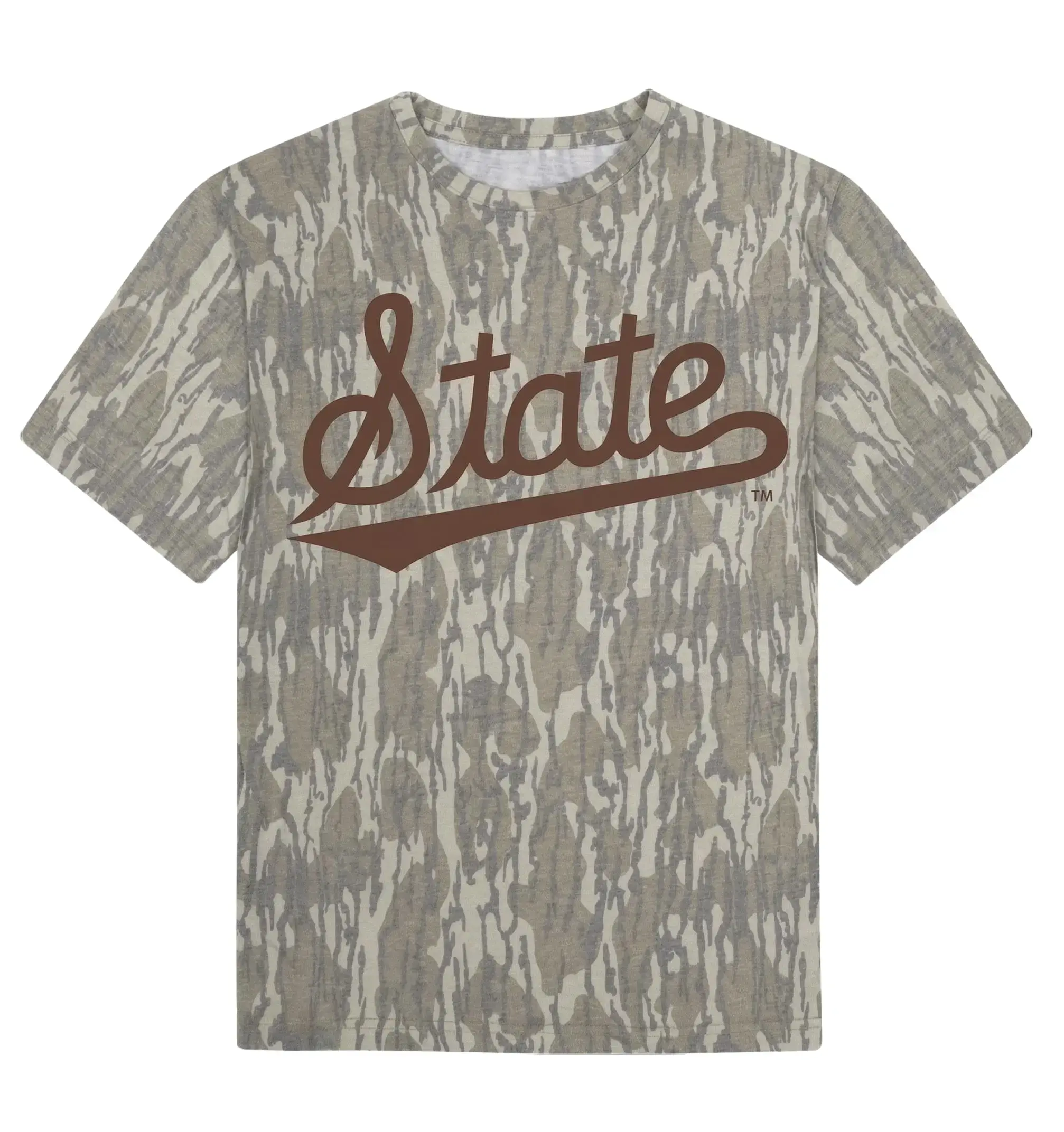 Script Brown State Mossy Oak Camo T-Shirt, Vintage Bottomland Camo Tee, Mossy Oak Washed Out Camo Logo Tee, 3D Camo Style T-Shirt, Camo T-Shirt Unisex Outdoors
