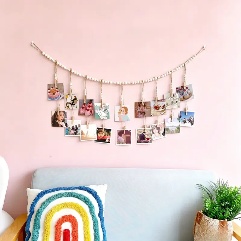 This boho-style photo display garland is the ultimate rustic wall decor for your home, dorm, nursery, or office! Made with natural wooden beads and sturdy clips, it’s designed to showcase your favorite photos, polaroids, art prints, and more with effortless charm.