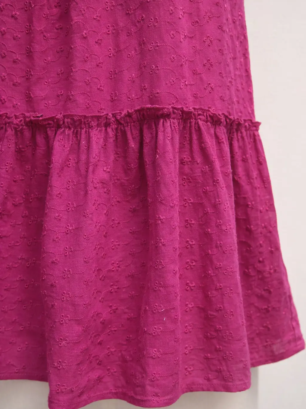 Bright, feminine, and easy to wear, this fuchsia cami top adds a playful statement to your warm-weather wardrobe. Designed with delicate spaghetti straps, embroidered trim at the neckline, and a flowy tiered babydoll silhouette, it brings soft texture and movement while keeping the look light, flattering, and easy to style.
