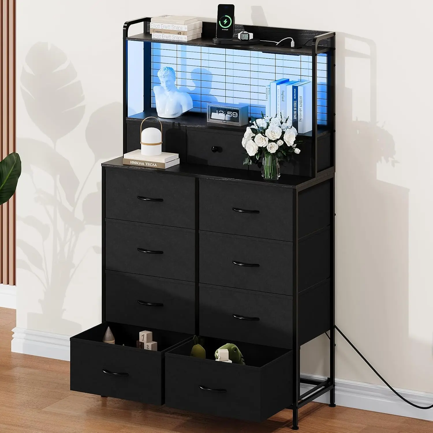 ·【All-in-One Charging Station & Wireless Charging Hub】Keep your phone, tablet, and devices powered and cords organized. This fabric drawer dresser features 2 AC outlets, 2 USB ports, and a top wireless charging pad for simultaneous, convenient charging.