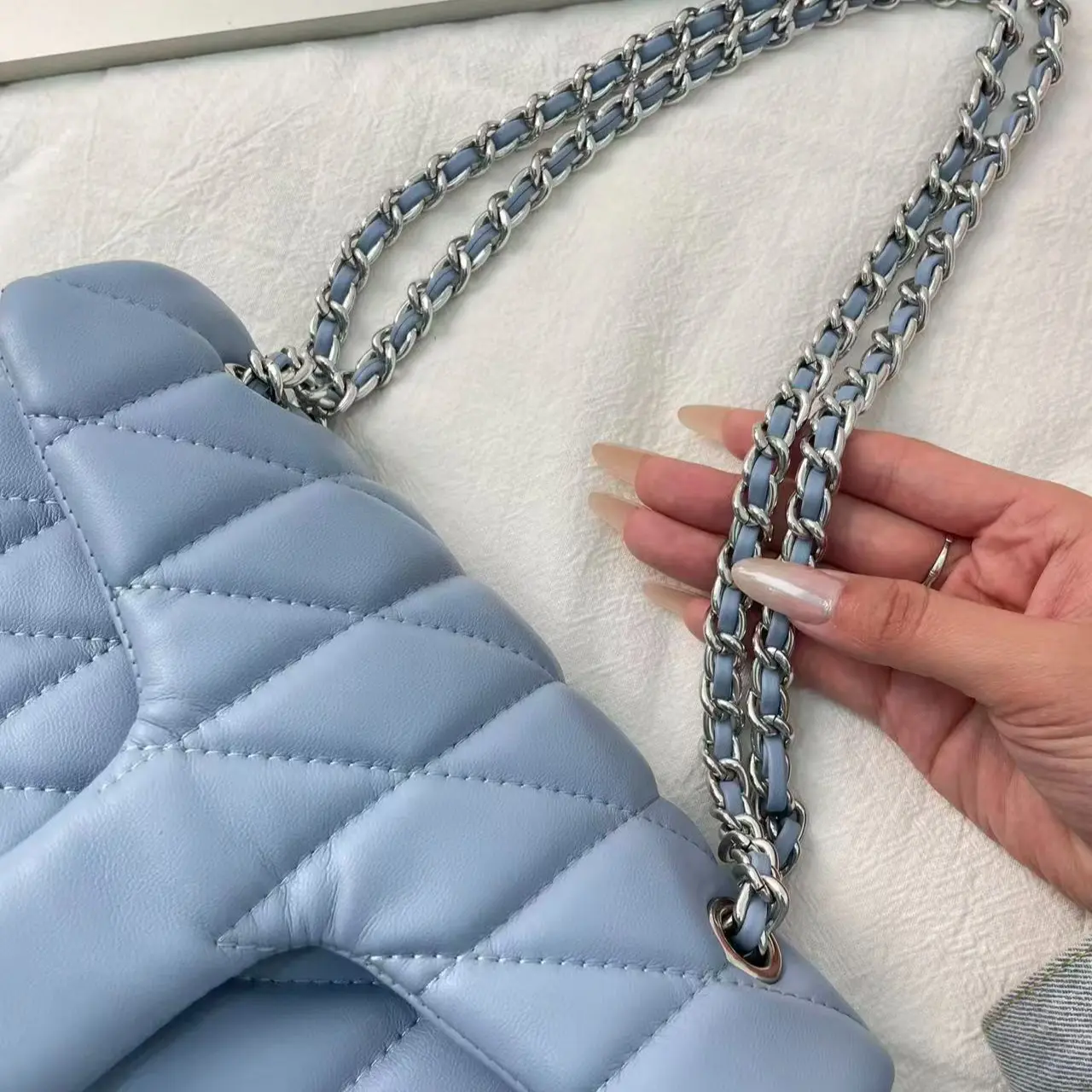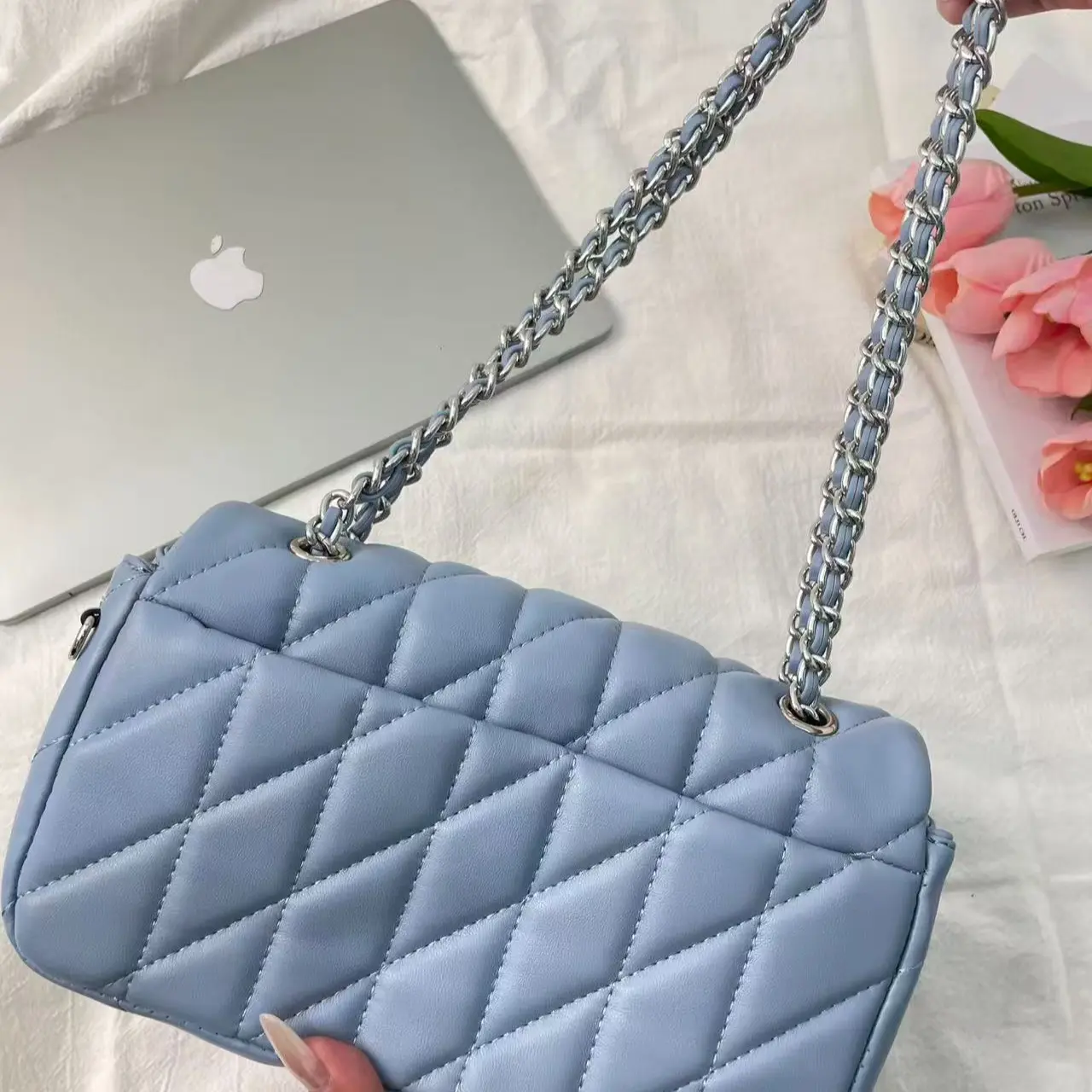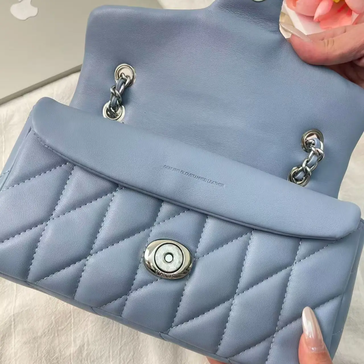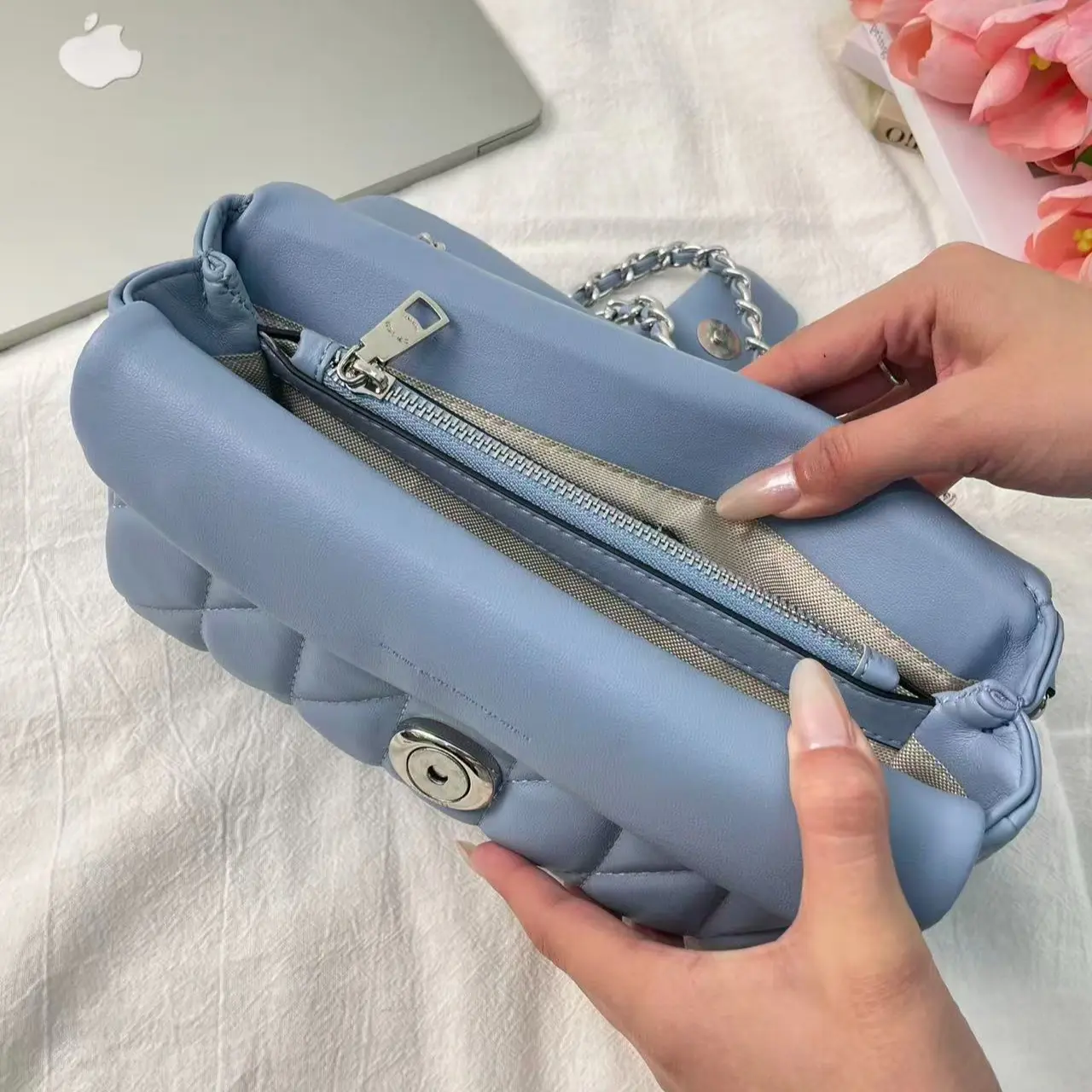 【Timeless Quilted Aesthetic】 Adorned with a classic diamond-quilt pattern and a signature flap closure, this shoulder bag captures the essence of sophisticated French style. The elegant Glacial Blue hue adds a fresh, modern twist to a timeless silhouette, making it a perfect statement piece.
