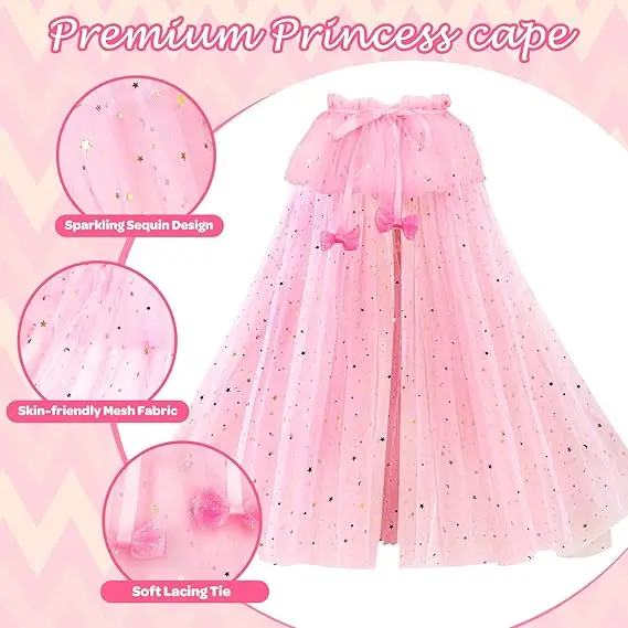 ·Comfortable & Sparkling Cape:Shylizard princess costume for girls is made of soft and comfortable sheer mesh fabric, which provides a gentle touch on skin, making it comfortable to wear. Ribbon with bow design can prevent the cape slipping off during your girls' play time.What's more, this cape features sparkling design of star and moon sequins, every girl who wants to be a princess will love it!
