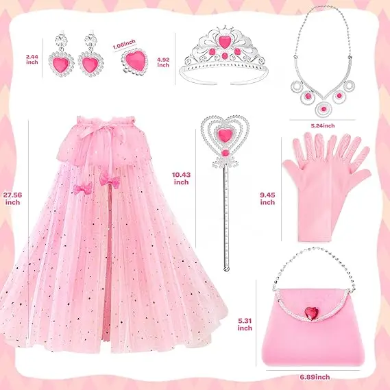 ·Princess Dress Up Set:Our dress up clothes set includes 1 glitter princess cape, 1 crown tiara, 1 princess wand, 1 necklace, 1 play purse, 1 ring, 2 earrings, a pair of gloves. All accessories are neatly packed in a exquisite box, easy to carry and store, which allows girls to make princess role play games at various indoor or outdoor parties! Great gift for girls 3 years and up.