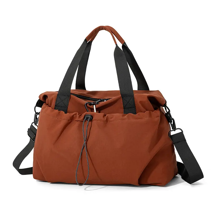 The bag's water-resistant material protects your items from spills. Its expandable design offers extra space when needed. The drawstring closure keeps contents secure. Perfect for various activities, it combines functionality with style. The shoe compartment adds practicality. Ideal for short trips and workouts, it's a must-have for active lifestyles.