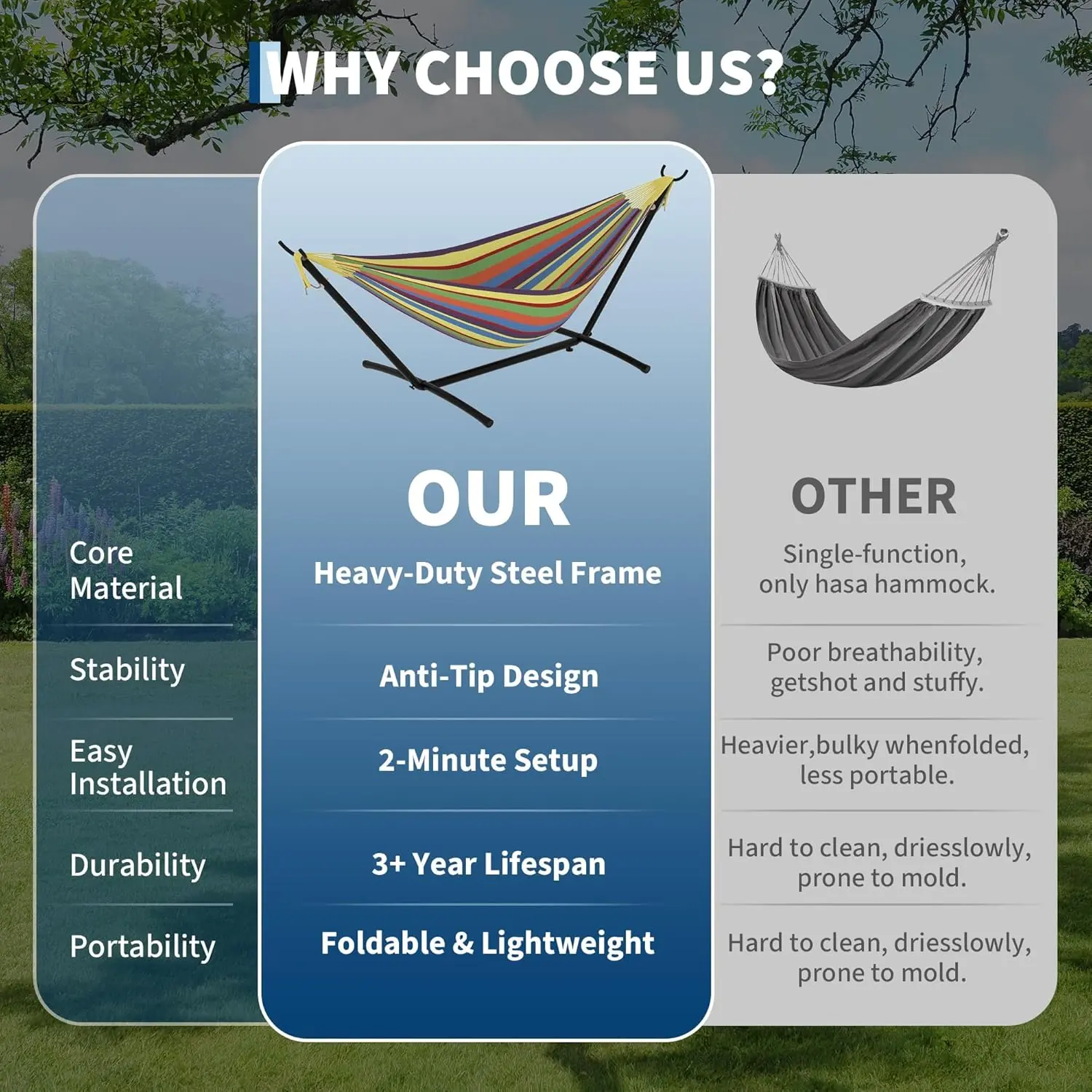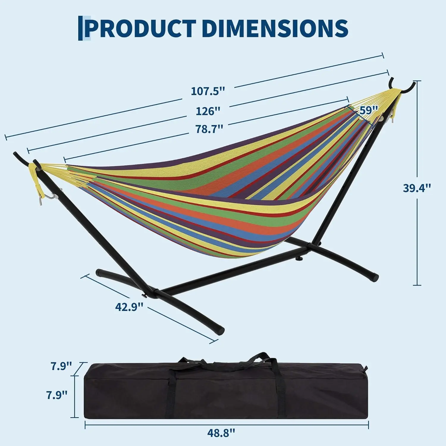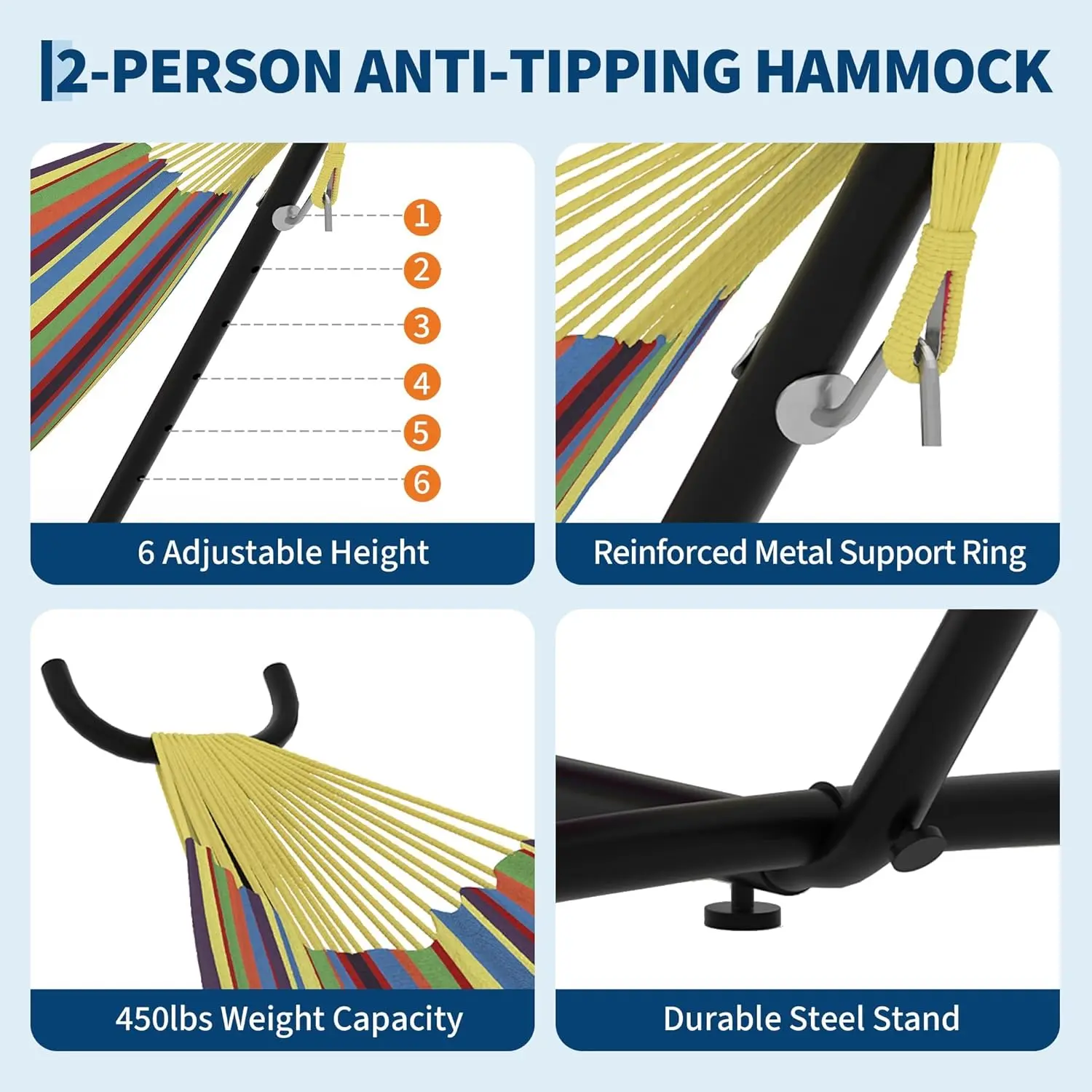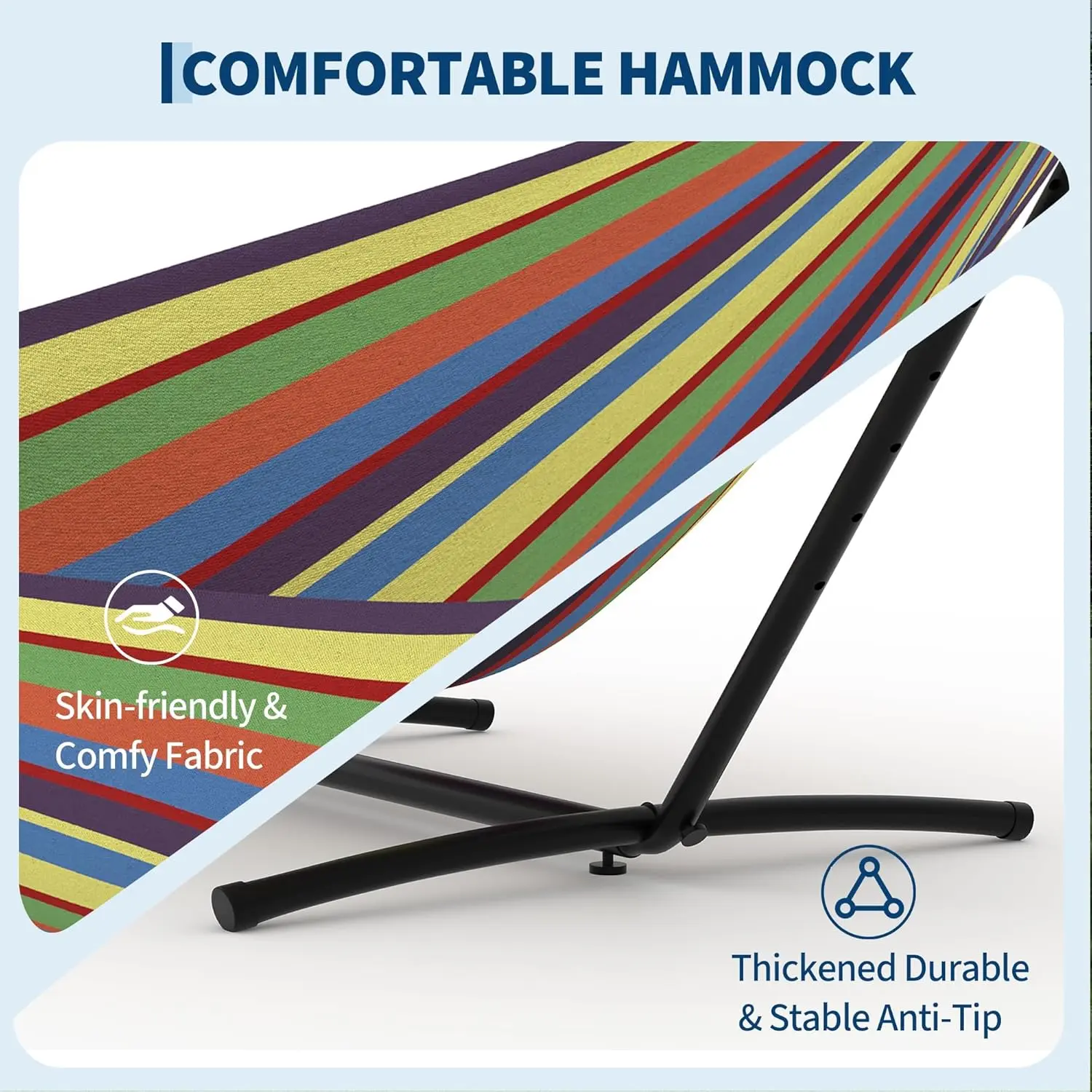 ·Portable with Stand Included: Comes with a sturdy, easy-to-assemble stand that allows you to set up the hammock anywhere without needing trees or posts.
