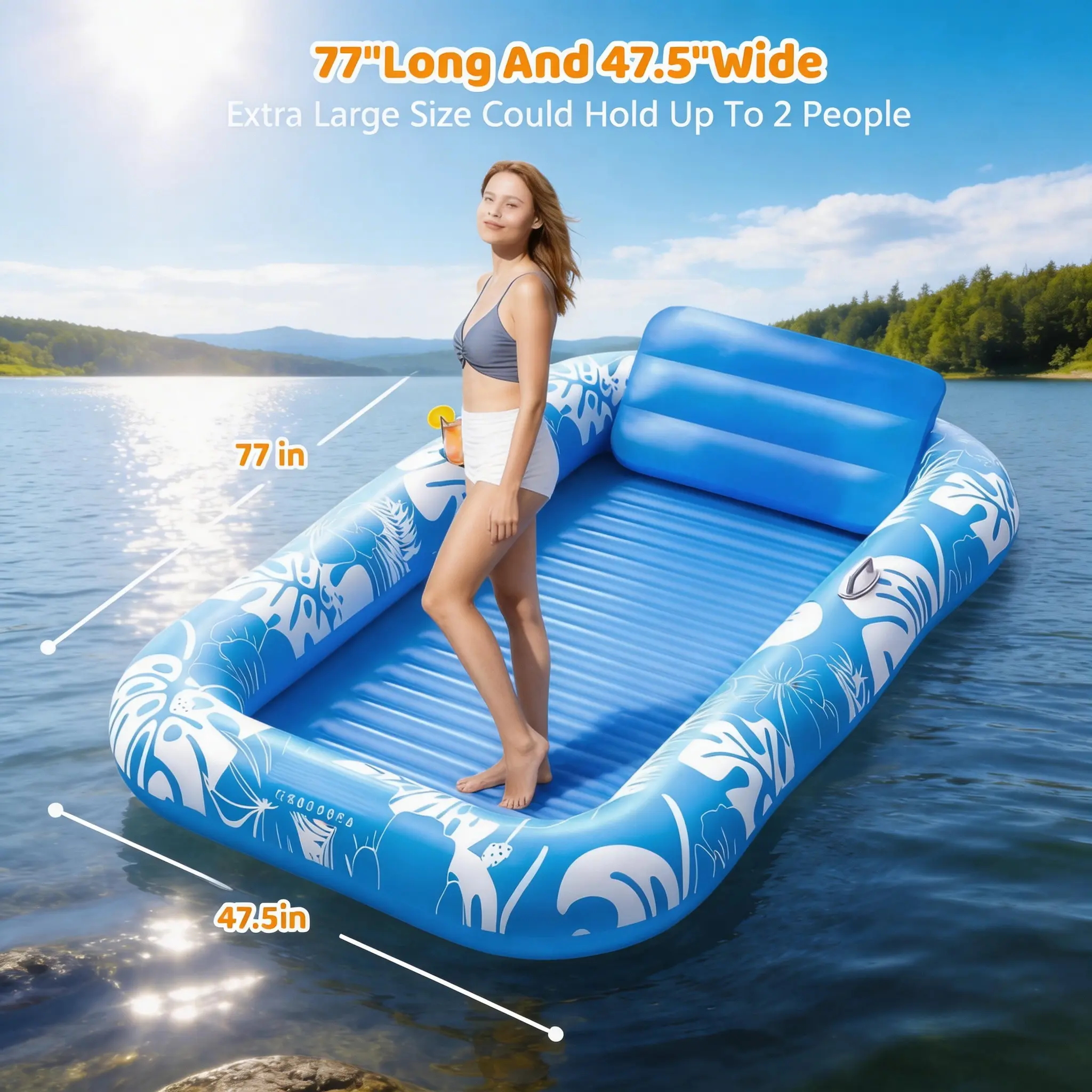Measuring 70" x 46", this inflatable lounger comfortably fits 1-2 adults. Great for solo sunbathing or relaxing with a friend.