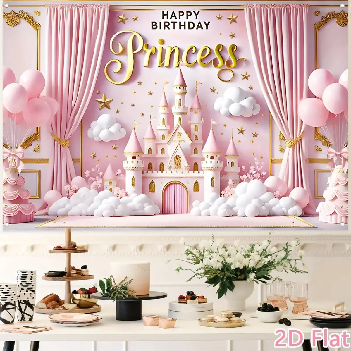 Pink birthday celebration background fabric, princess-themed party balloon castle pattern background fabric, birthday party decoration, baby party photography supplies, birthday party banner tapestry funny room tapestry durable man