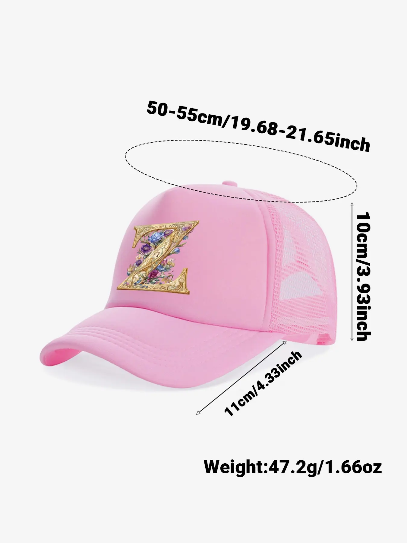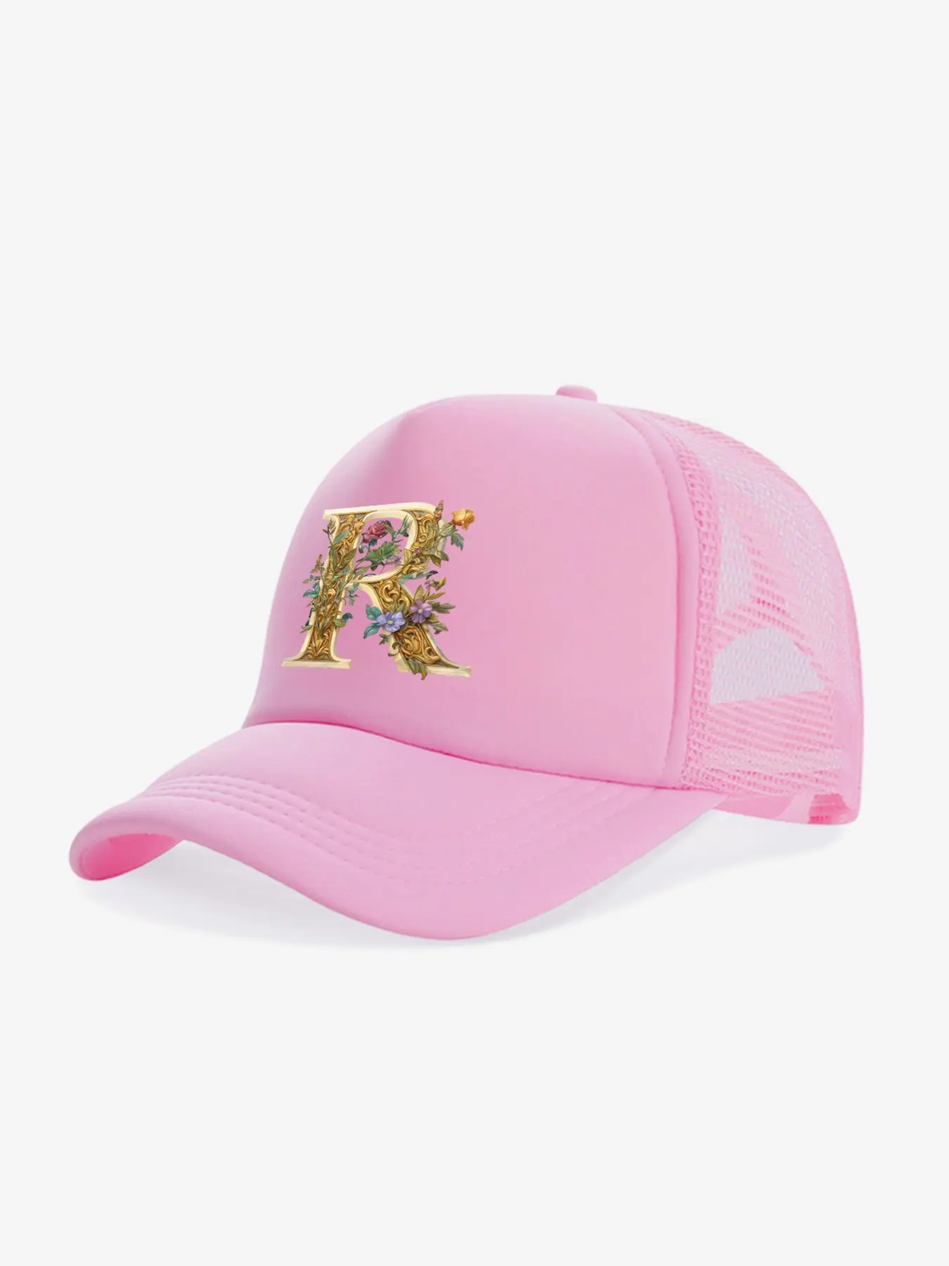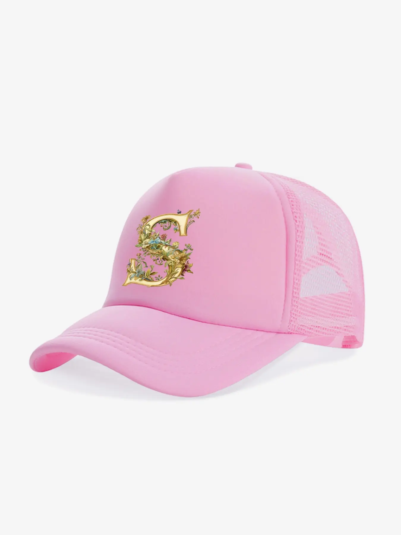 This girls initial letter floral mesh baseball cap is a perfect combination of style and practicality specially designed for little girls, ideal for summer outings. 26 letter options are available, with retro gold foil letters paired with exquisite floral prints, customizable exclusive letters to create personalized outfits, full of girlish charm in pink, easily creating a stylish look.
