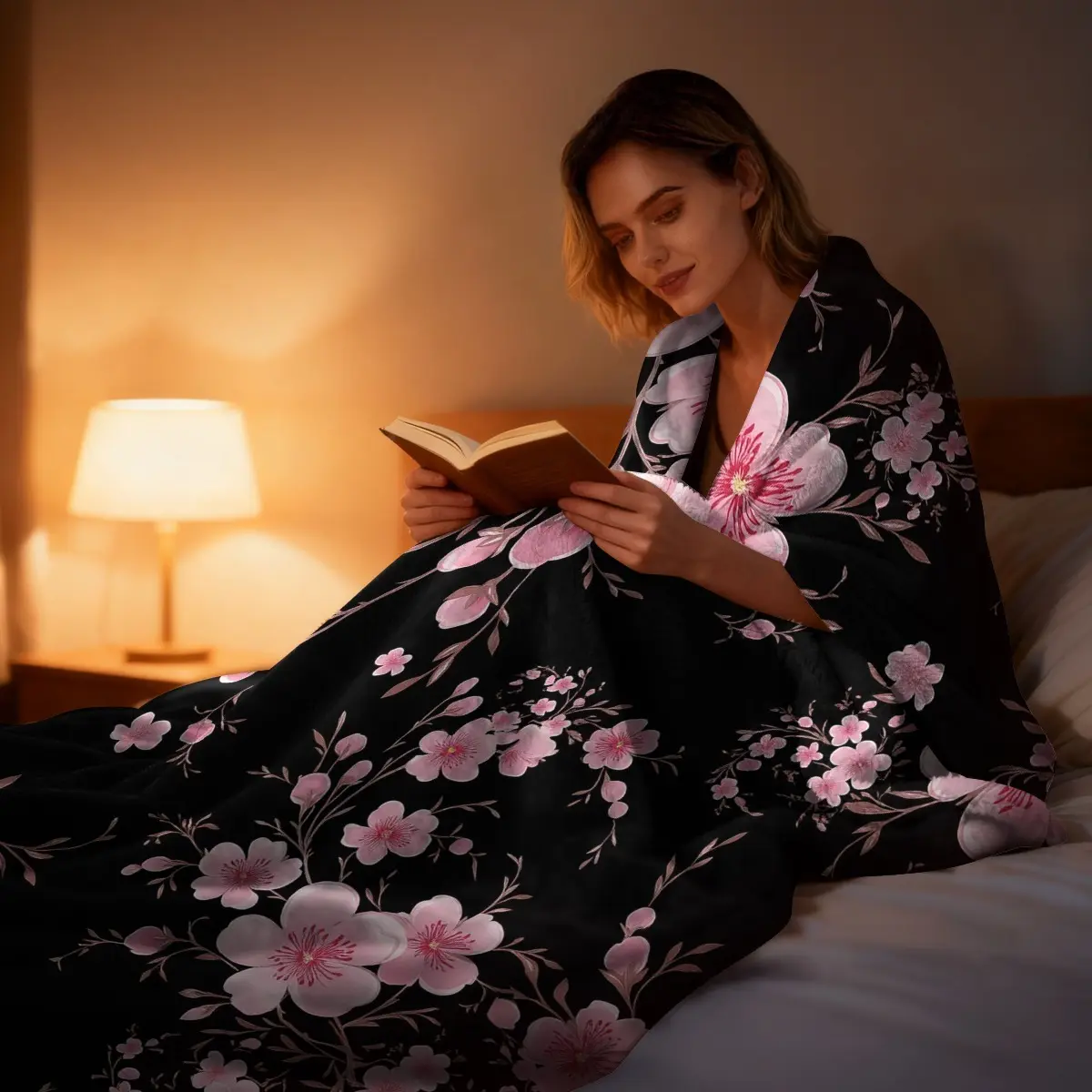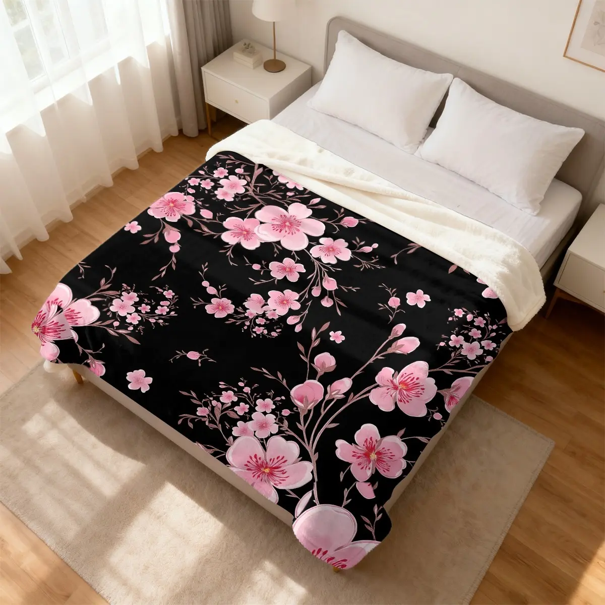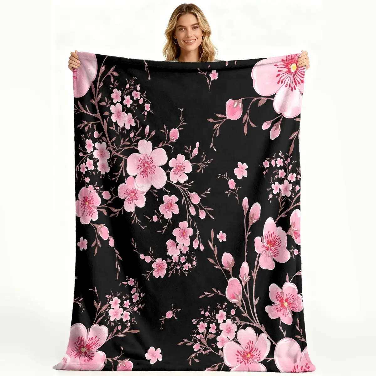 Pink Cherry Blossom Sakura Floral Gift Soft Cozy Flannel Blanket Black Background Sakura Flower Print Plush Throw Warm Fuzzy Bedroom Sofa Couch Blanket Perfect Birthday Housewarming Mother's Day Gift for Women Girls Mom Home Decor