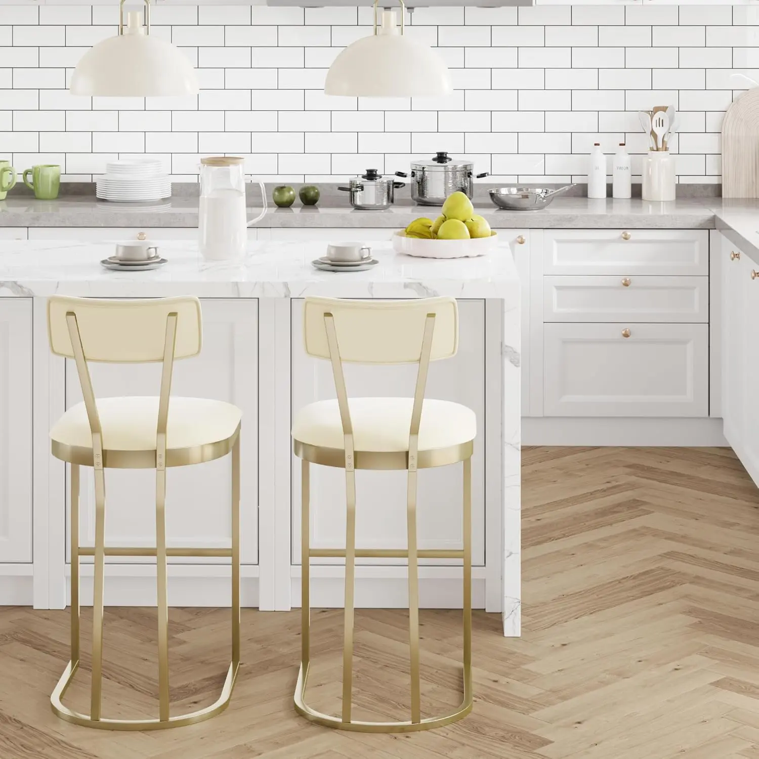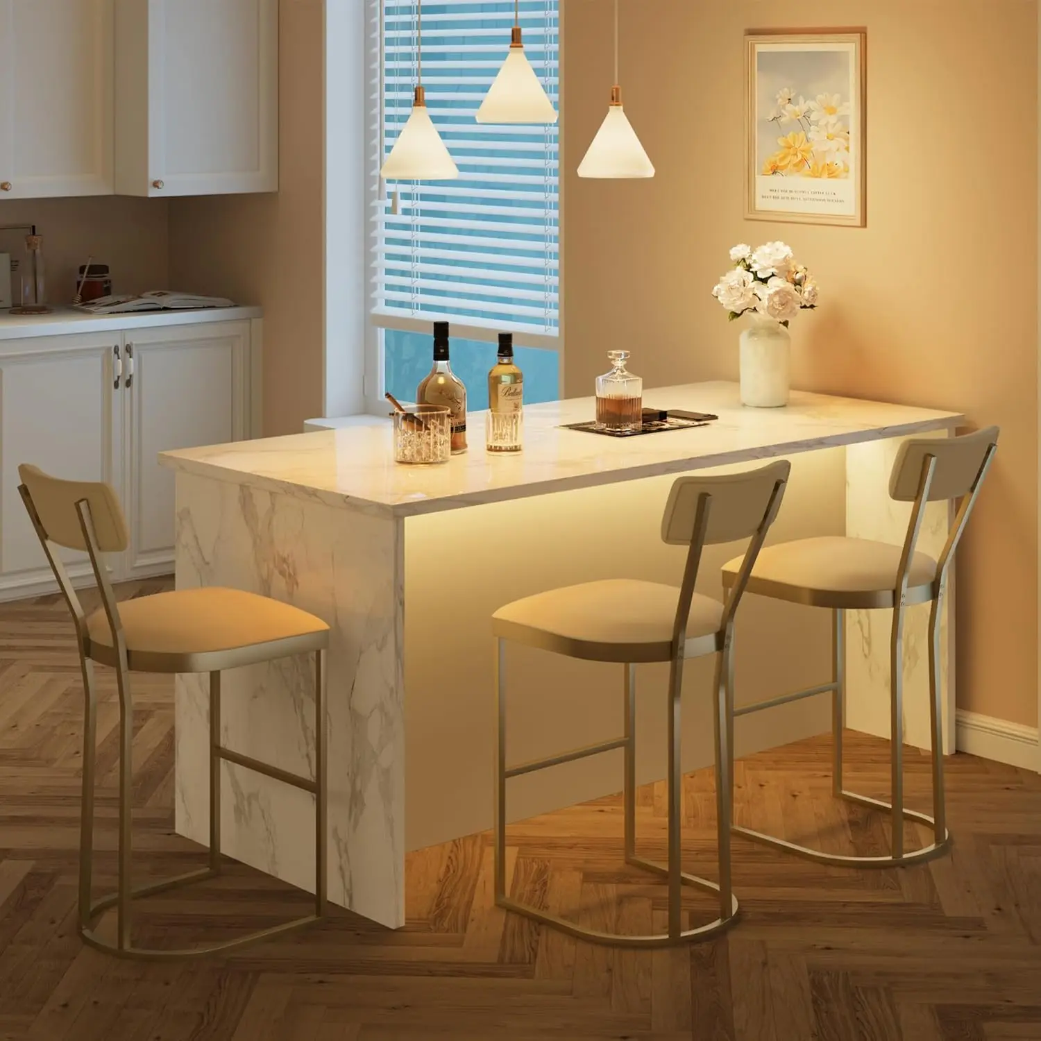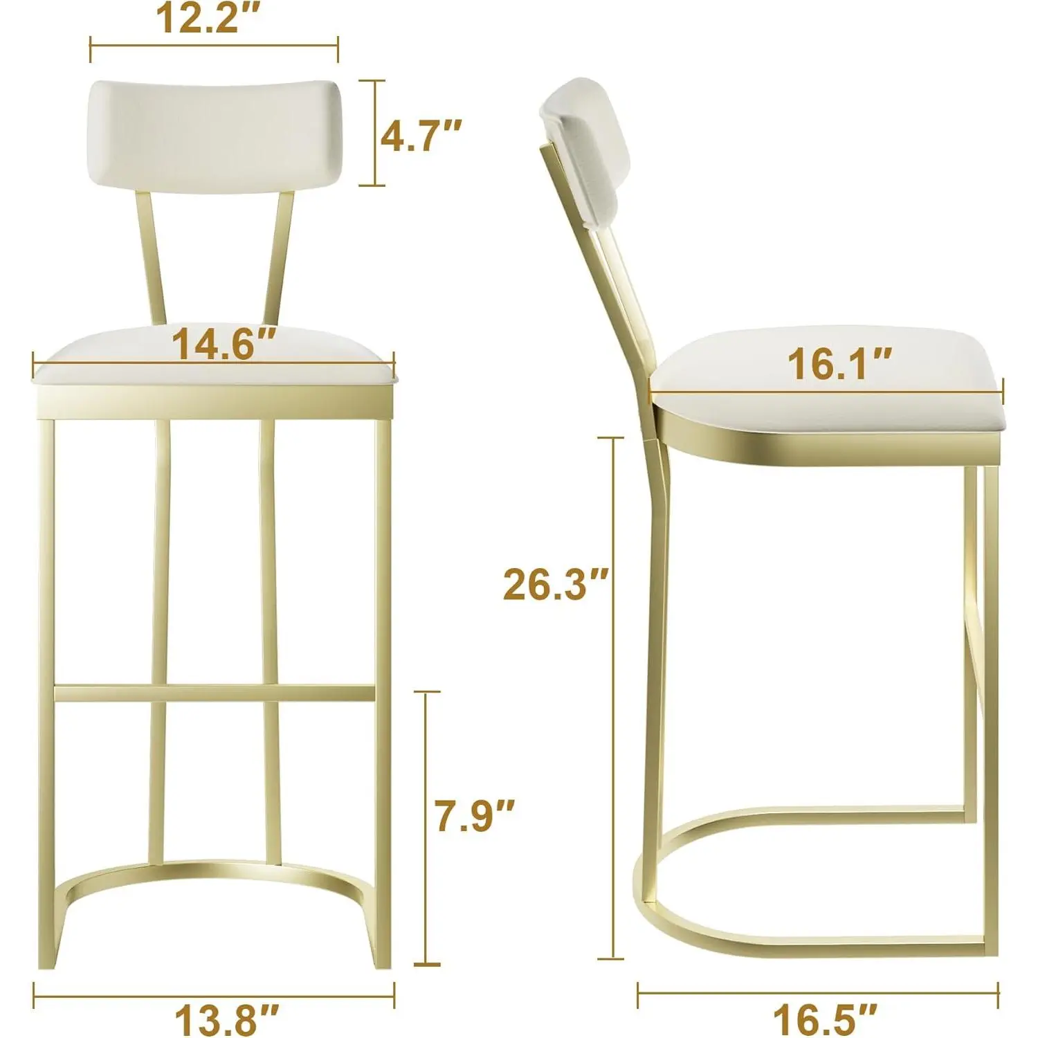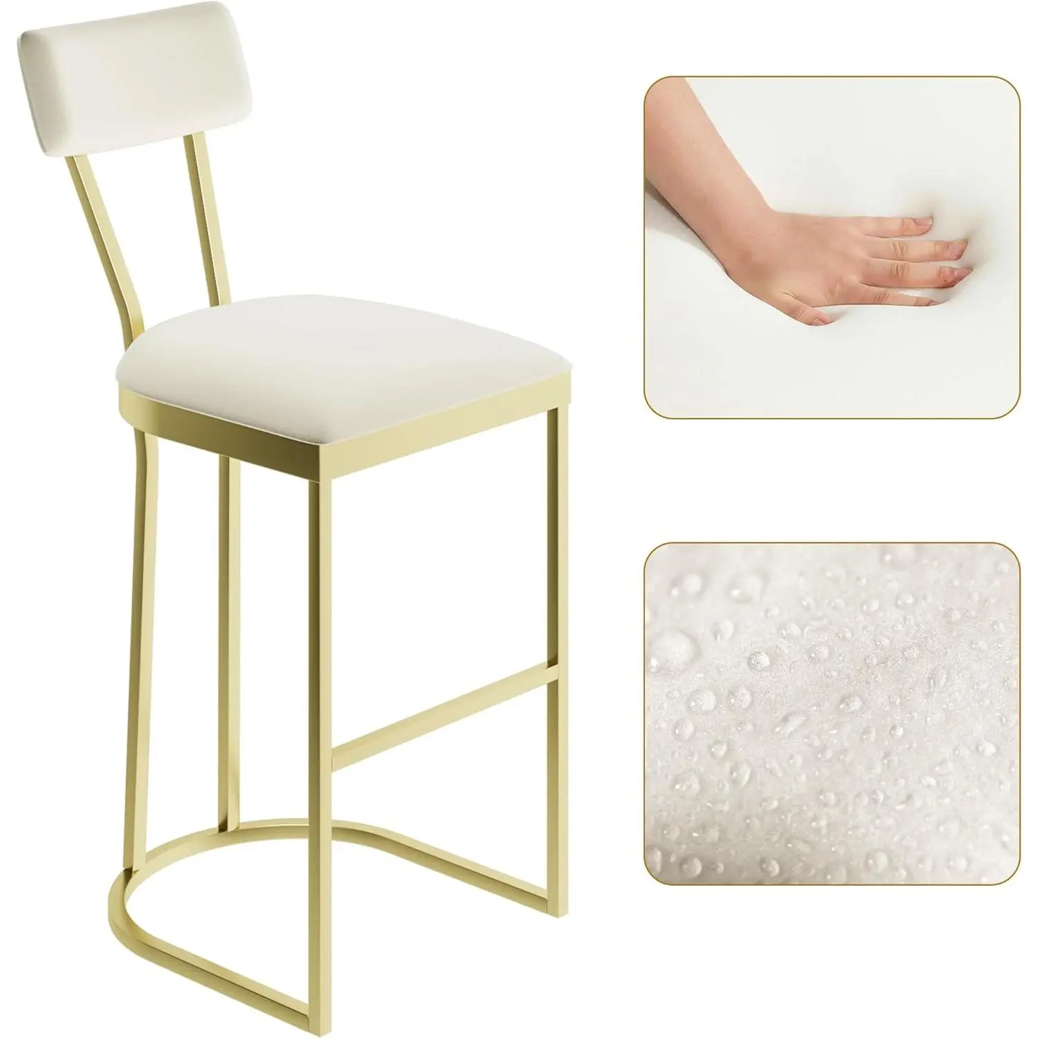 ·Multi-space versatility : Compact and luxurious in design, with a 16.5-inch length, these stools for kitchen counter fit narrow kitchen islands, home bars, cafes, and more, and are suitable for a wide array of decor styles, including modern, farmhouse, industrial, and more. The bar stools are upholstered in white velvet, which is easy to clean.