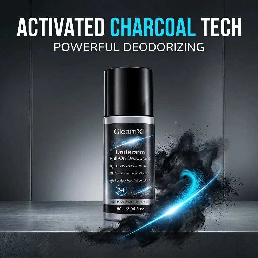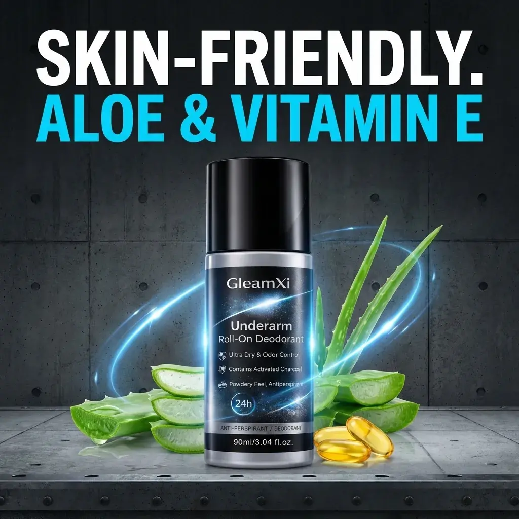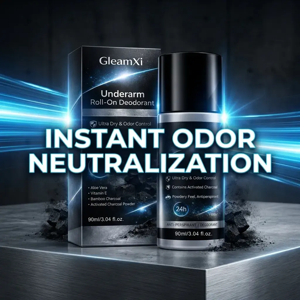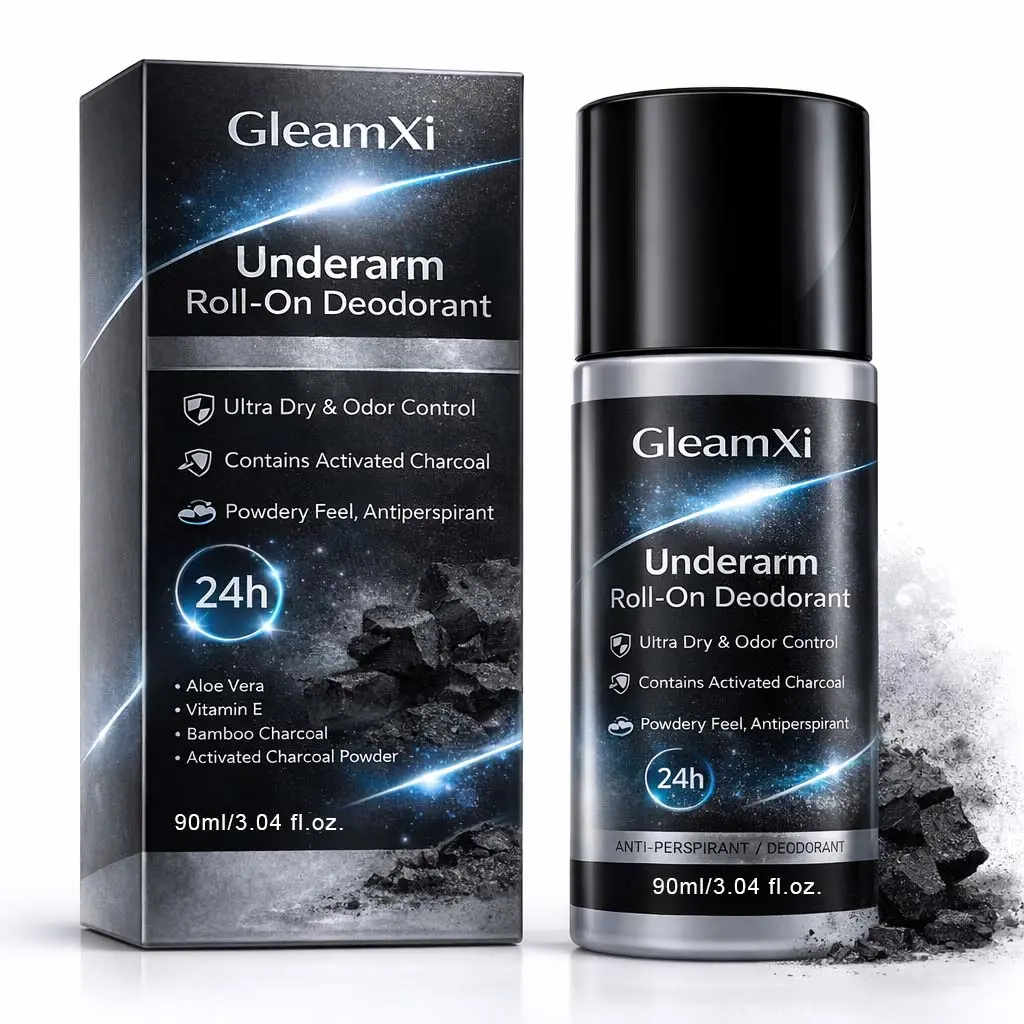 GleamXi Underarm Roll On Deodorant offers 24-hour ultra dry odor control. Perfect for sensitive skin, it ensures freshness throughout the day. The 90ml bottle is ideal for daily use.