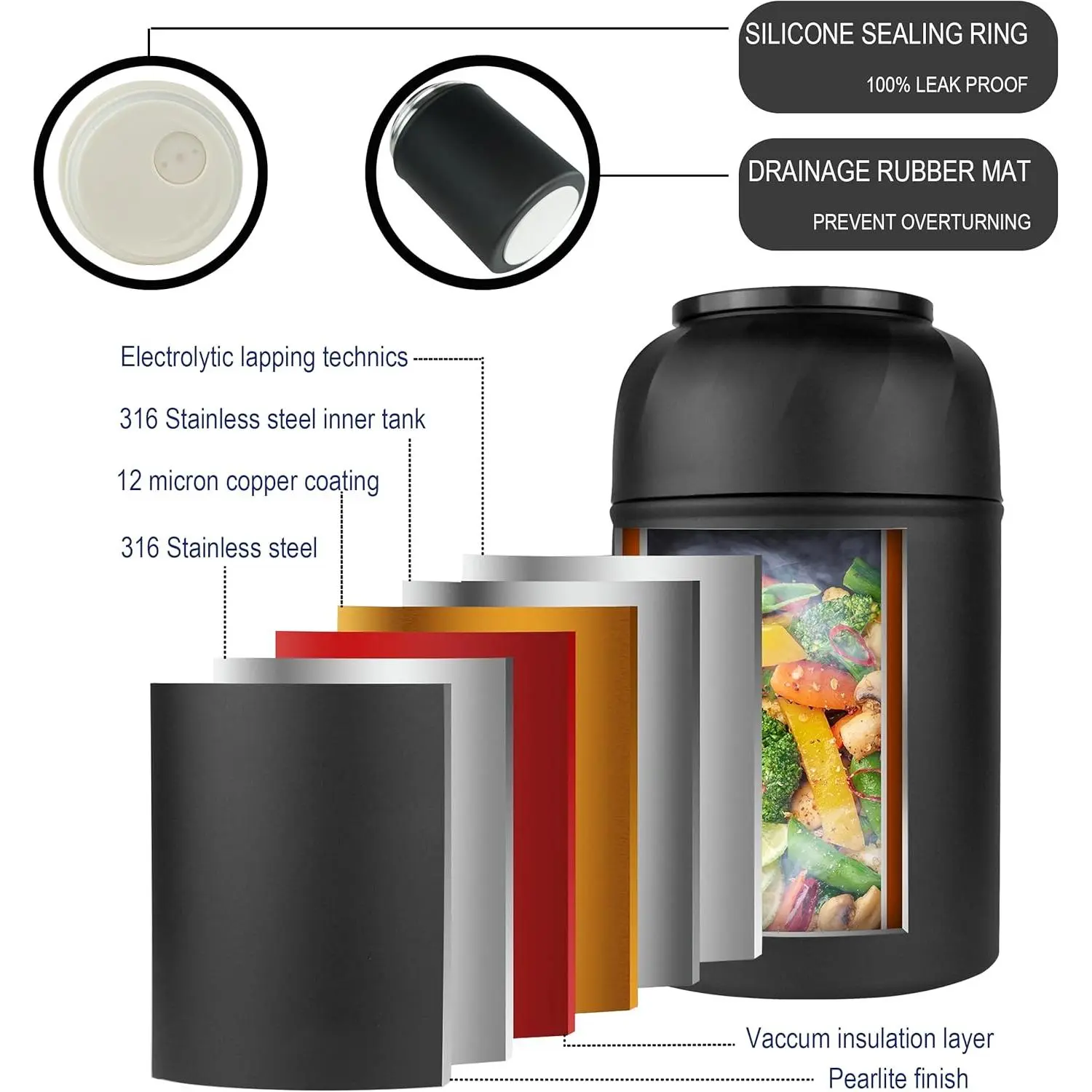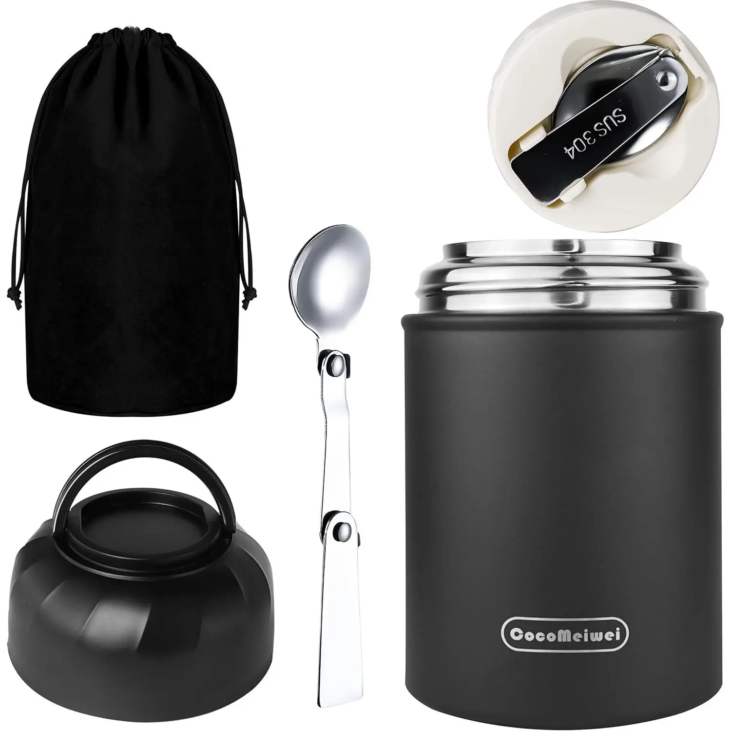Thermo for Hot Food & Drinks, Thermo Lunch Box, 17oz Vacuum Insulated Food Container with Spoon&Drawstring Bag, Soup Thermo for Adults, Black