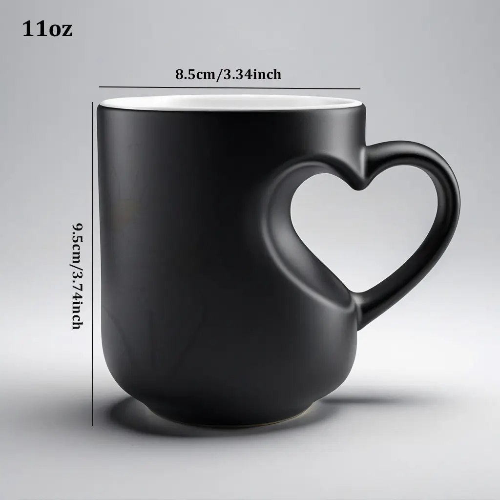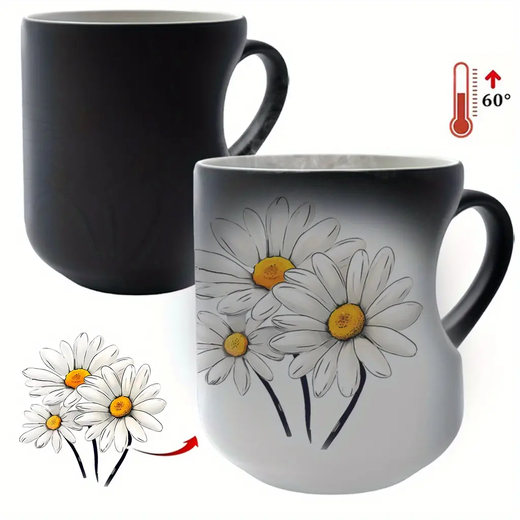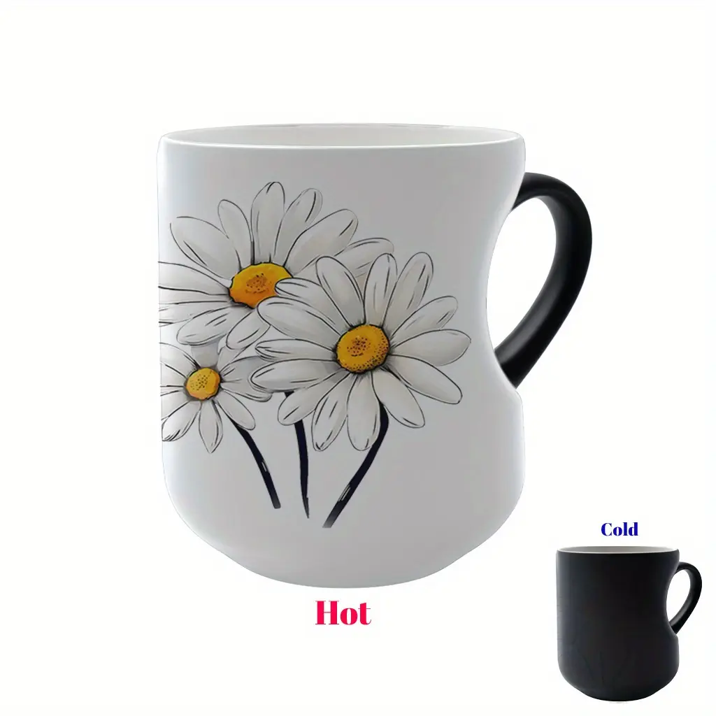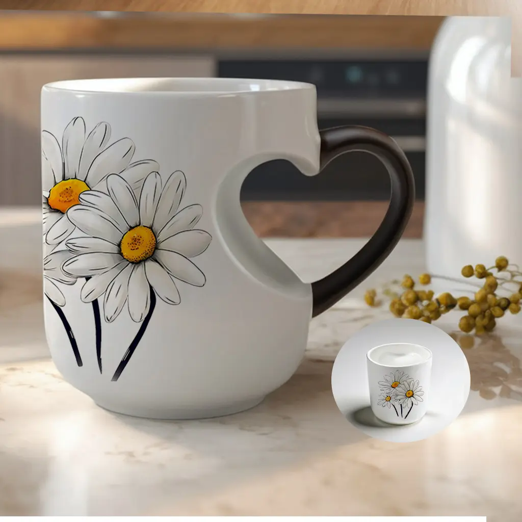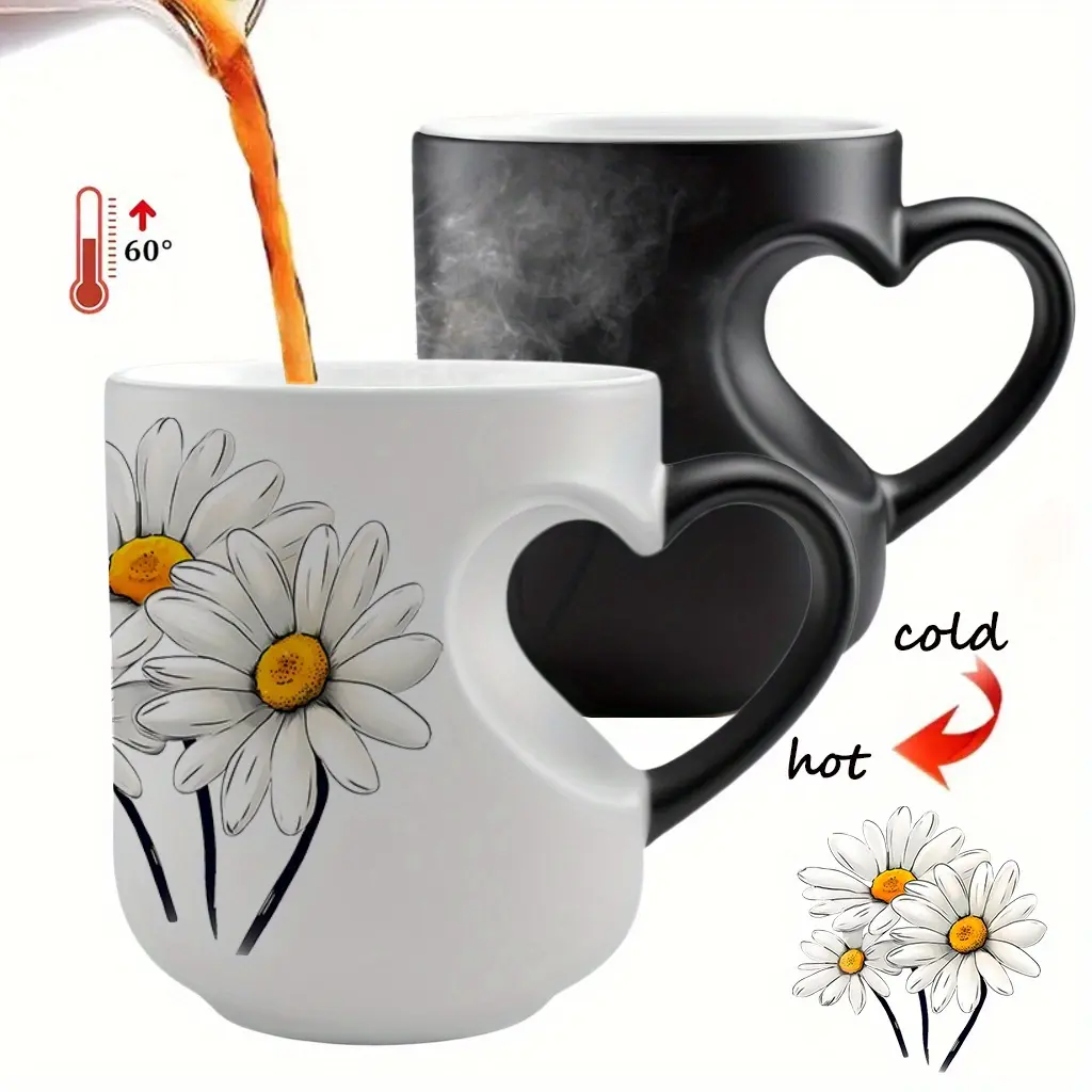 White Daisies Floral Pattern Ceramic Color Changing Mug, Heart Handle, 11 oz/330 ml - Great for Halloween, Christmas, Valentine's Day, Mother's Day and Father's Day Gifts