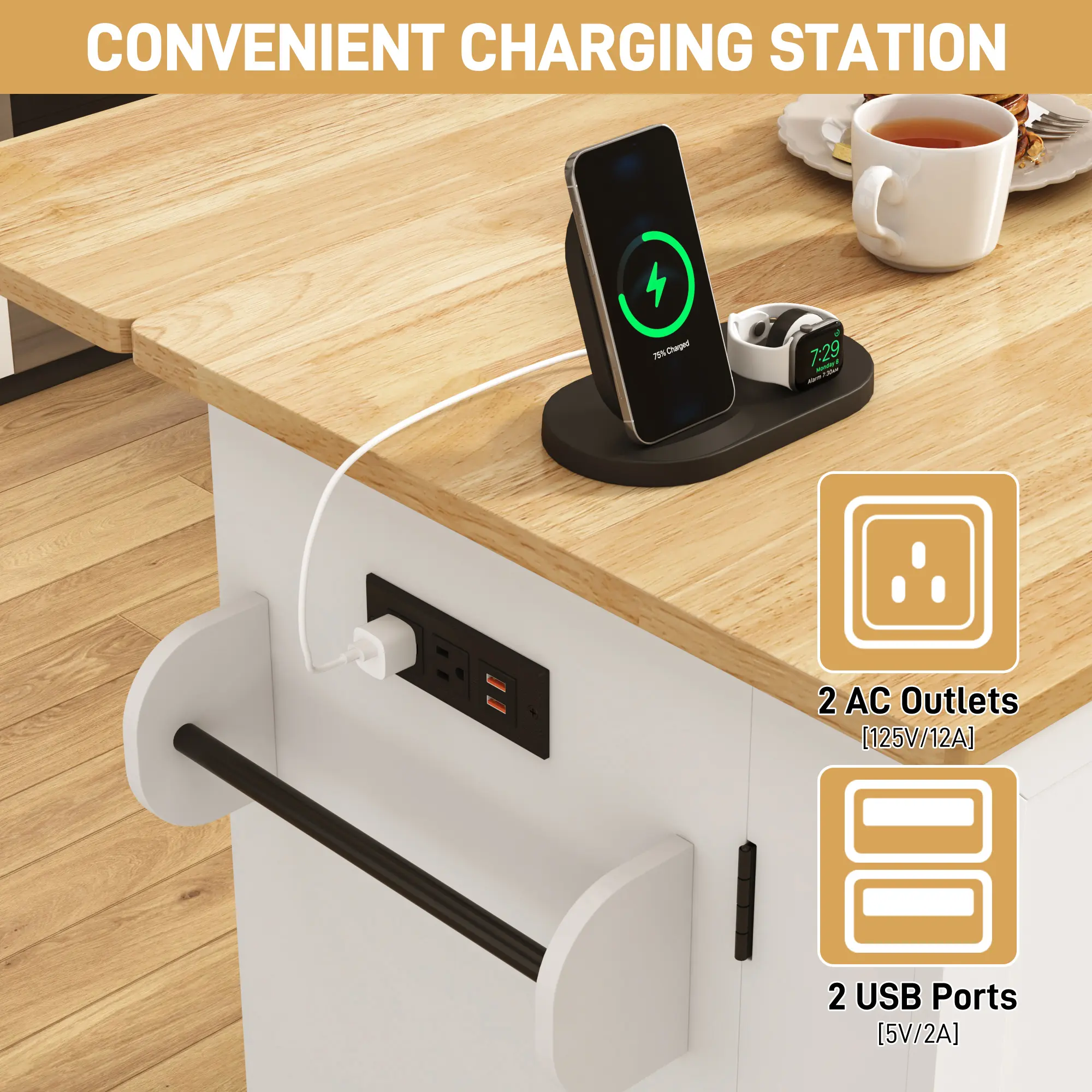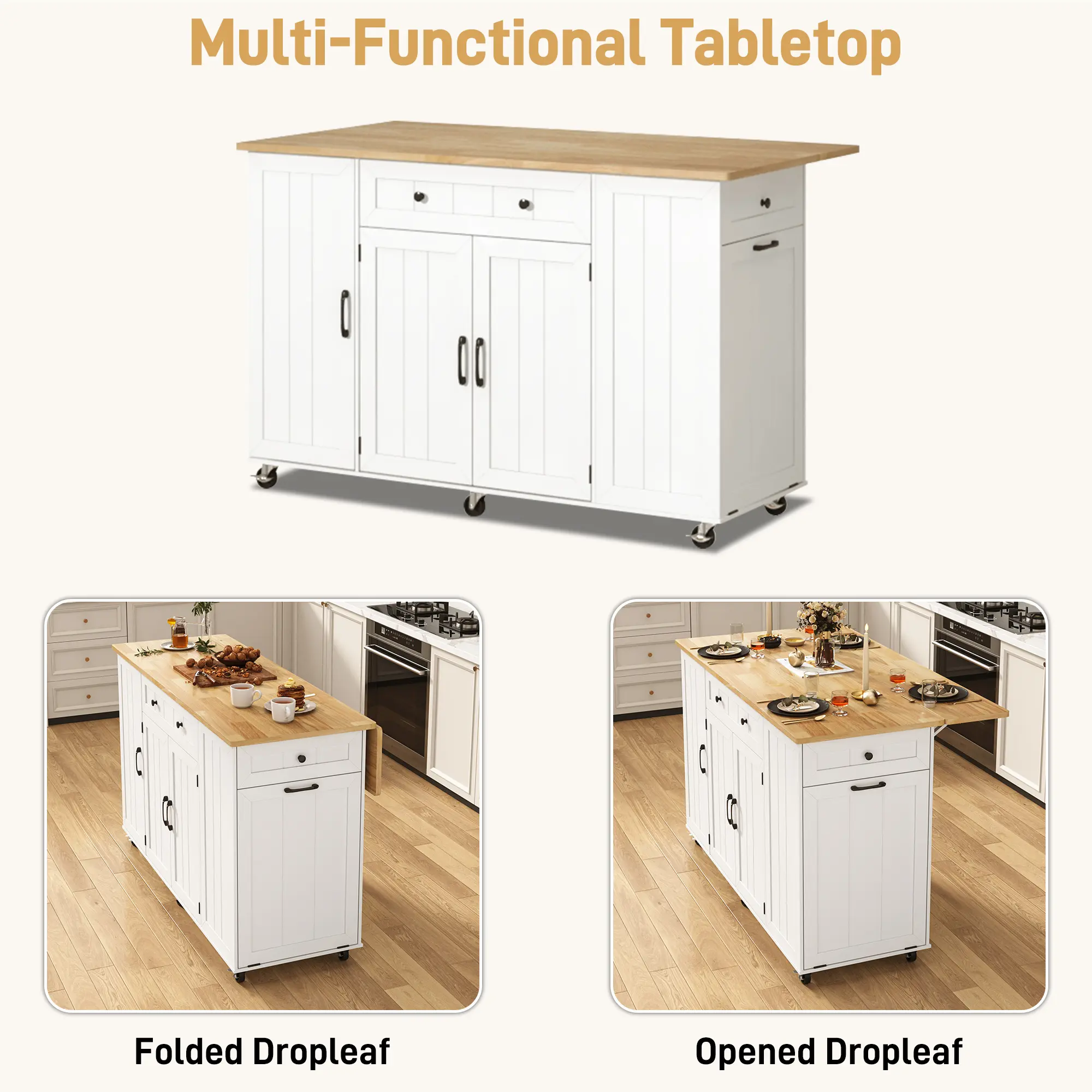 Drop Leaf Countertop: This 59" rolling kitchen island comes with a drop-leaf design and built-in power outlet, offering extra workspace for food prep and entertaining to boost kitchen functionality.