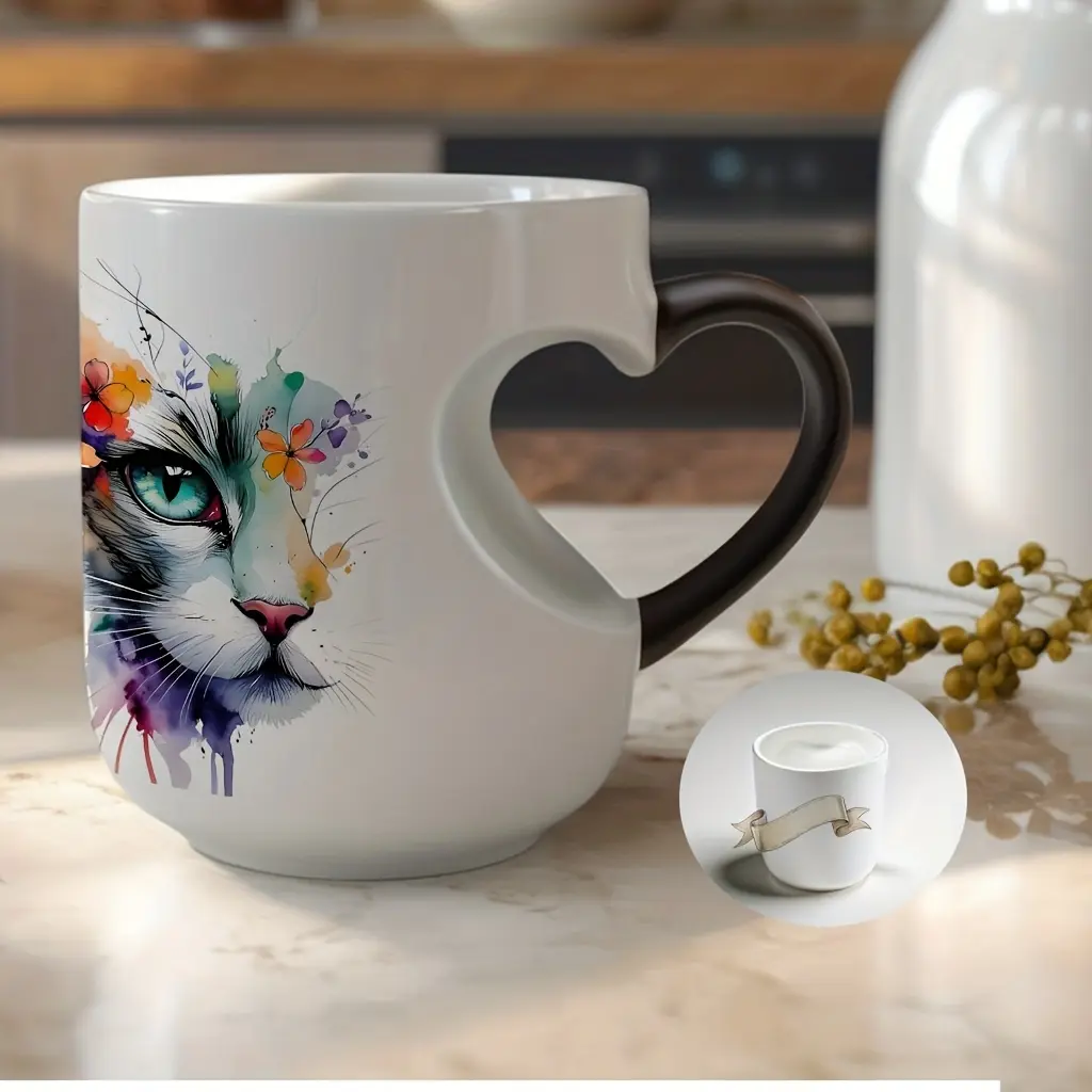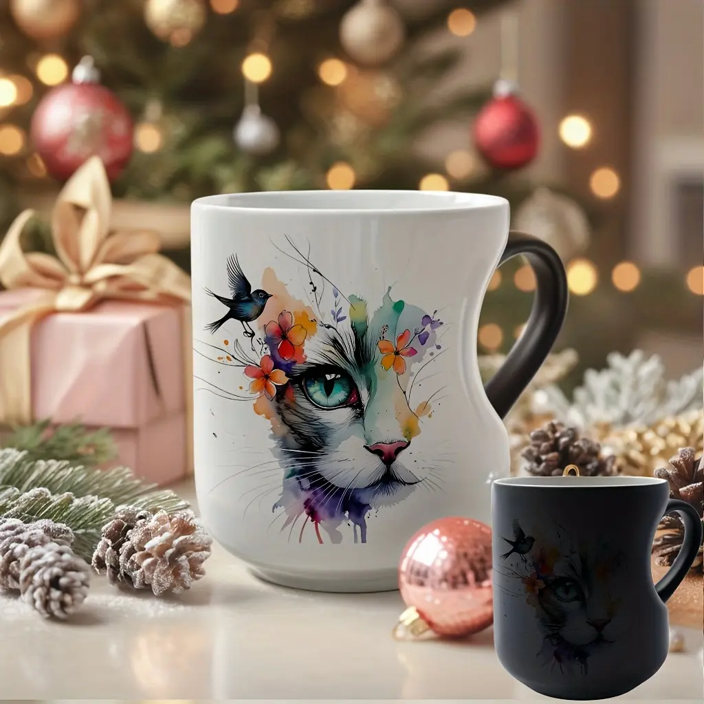 Playful Watercolor Cat Flower Decor: A vibrant artistic depiction set in a color-changing ceramic mug that changes color with temperature and features a heart-shaped handle. Perfect for coffee, this 11oz/330ml mug makes a wonderful Christmas gift