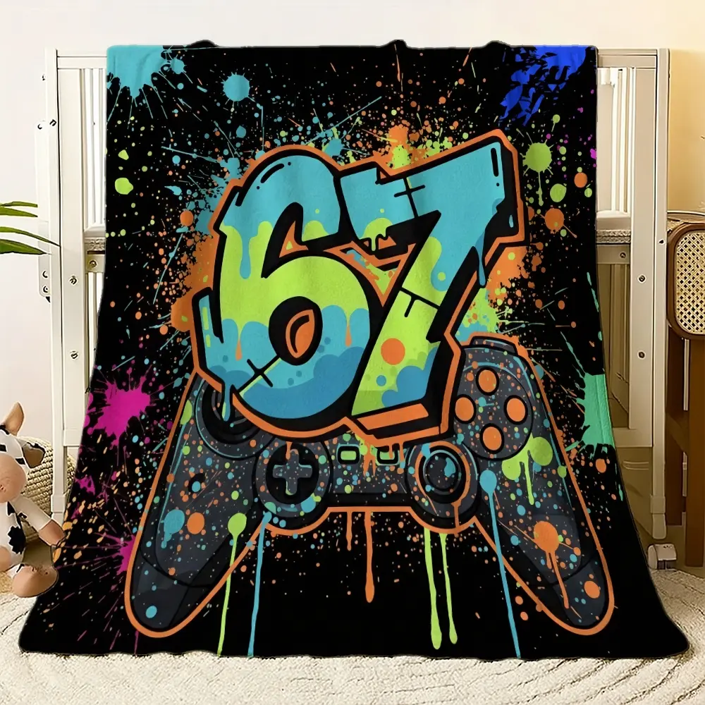 2D Flat Printing 1pc Brightly colored graffiti-style handle with numbers 67 Pattern Printed Blanket Flannel Fleece All Season Light Weight Living Room/Bedroom Warm Blanket