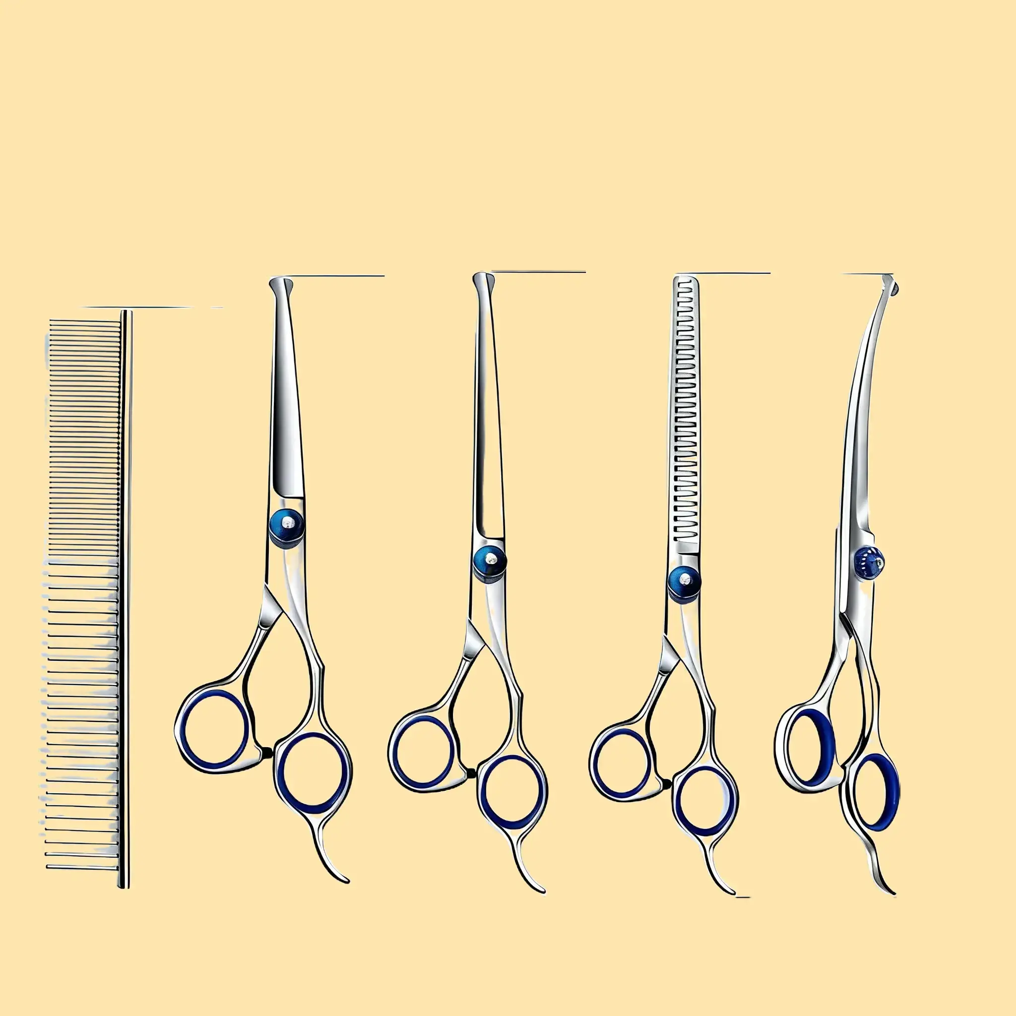 , including downward-curved scissors, straight scissors, upward-curved scissors, and a comb, to meet all your pet grooming needs.