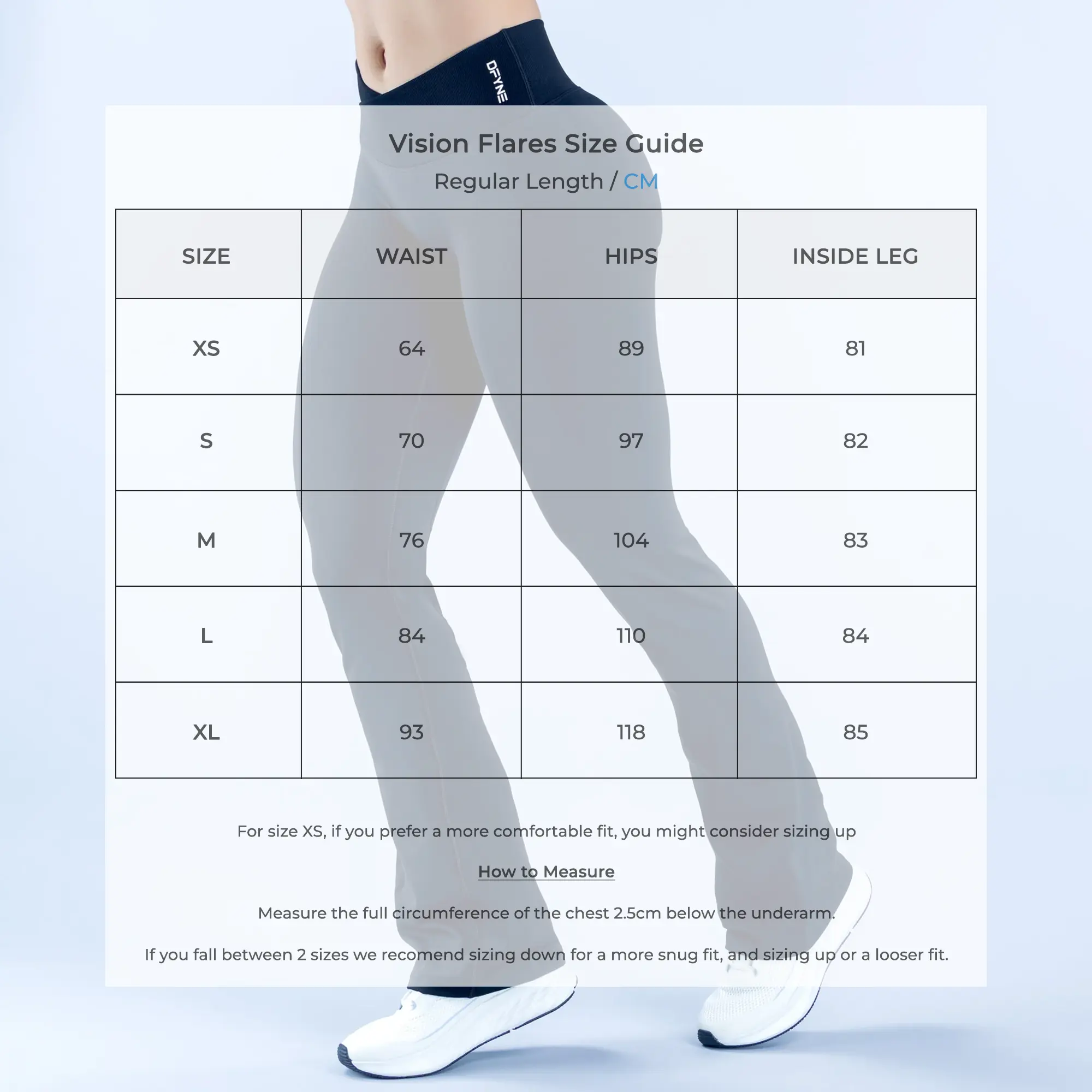 Go beyond with our VISION Flares. The crossover waistband snatches the waist and supports you through every workout. Designed with an invisible scrunch and sculpting zones to subtly highlight your muscles, creating that next level gym flare.