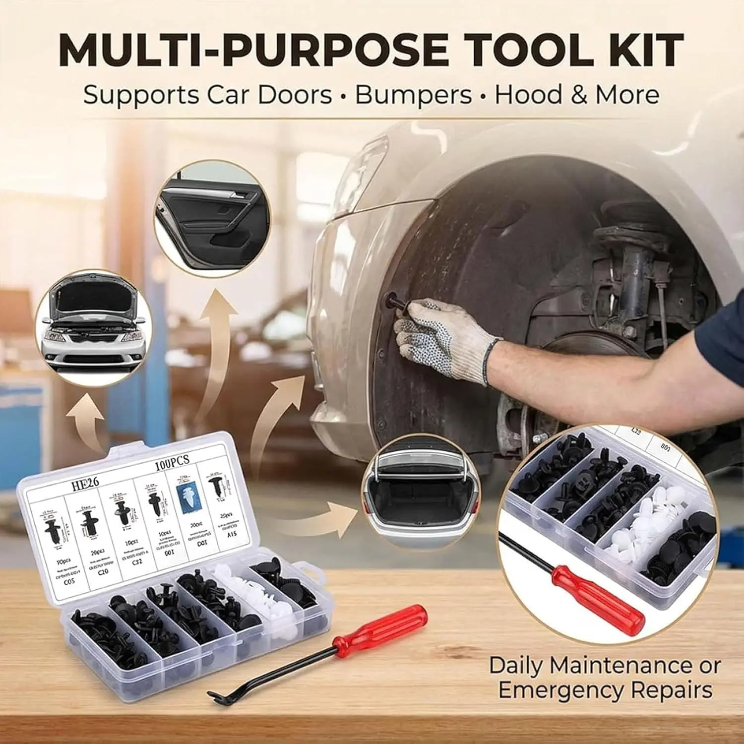 • With 100 pieces, you have ample supply for multiple projects. The kit includes all necessary sizes for common car models. Stay organized and prepared for any car repair or customization task.