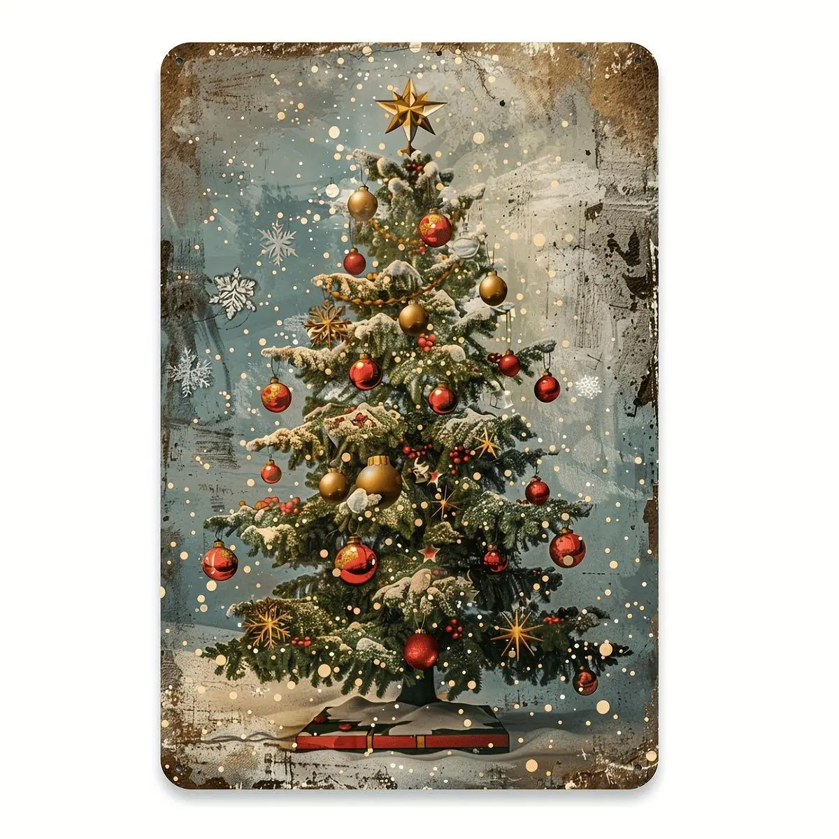 Vintage Christmas Tree Metal Tin Sign 2D Flat One Piece Rustic Wall Art Indoor Outdoor Decoration with Pre-Drilled Holes Durable Iron Tree Shape Sign for Office Cafe Garage Easy Install 8x12 Inches Perfect for Room Decor
