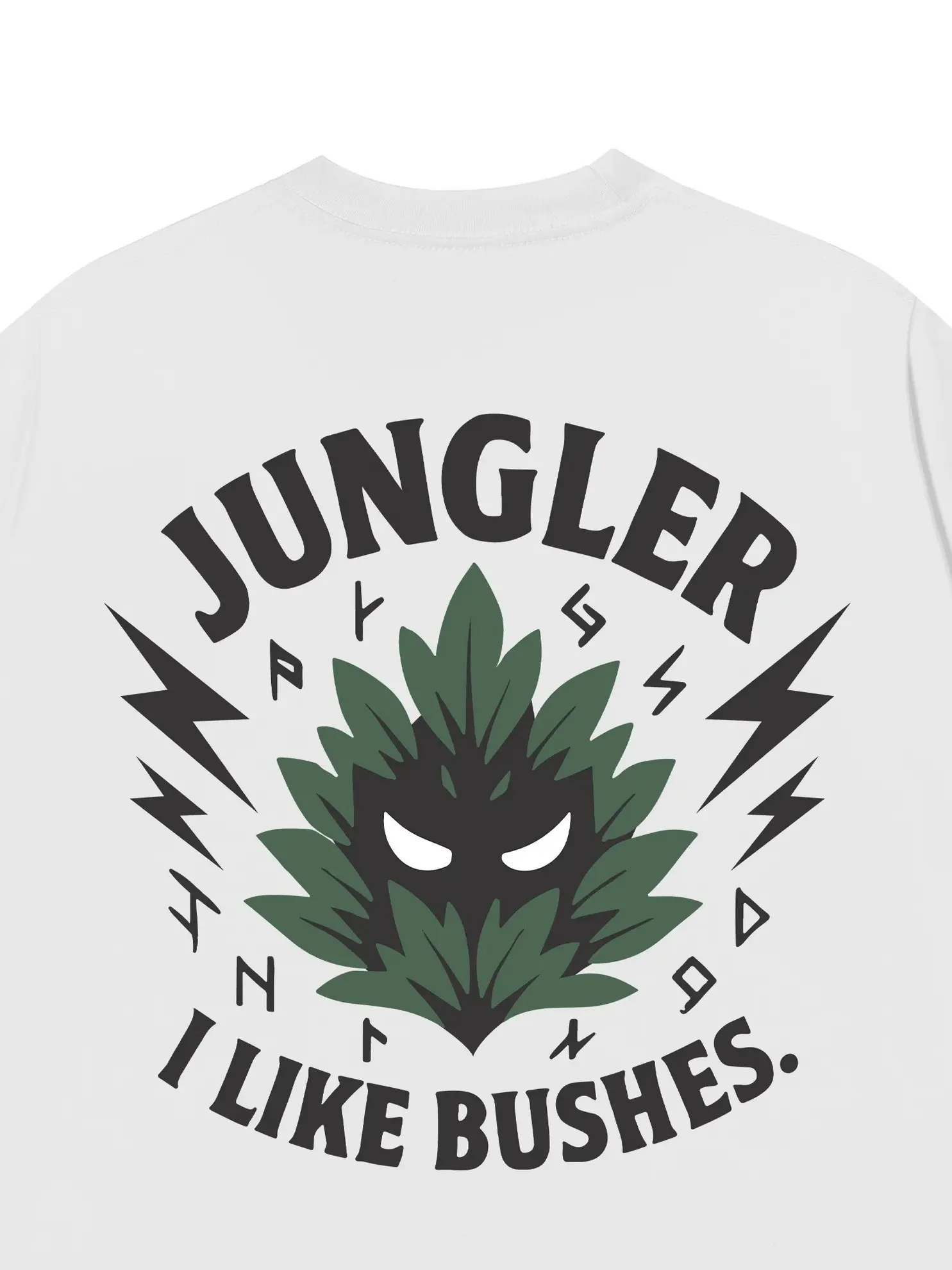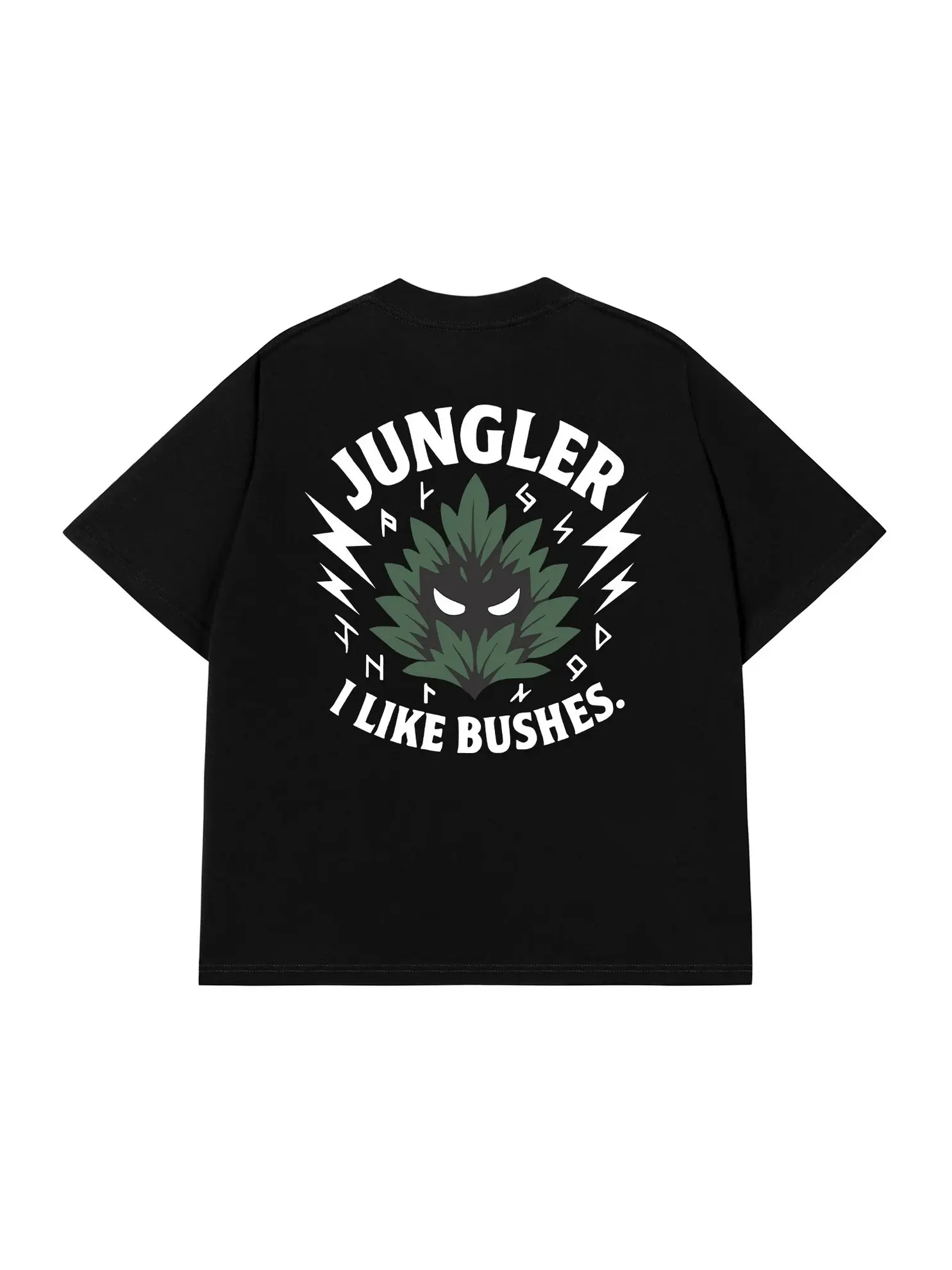Every jungler knows the truth — "I Like Bushes". This hilarious Jungler I Like Bushes Oversized Graphic T-Shirt is made for League of Legends players who live in the jungle. The bold back print features a menacing bush monster with glowing white eyes, surrounded by lightning bolts and the phrase “JUNGLER I LIKE BUSHES” in a circular design — perfect for ganking and camping.